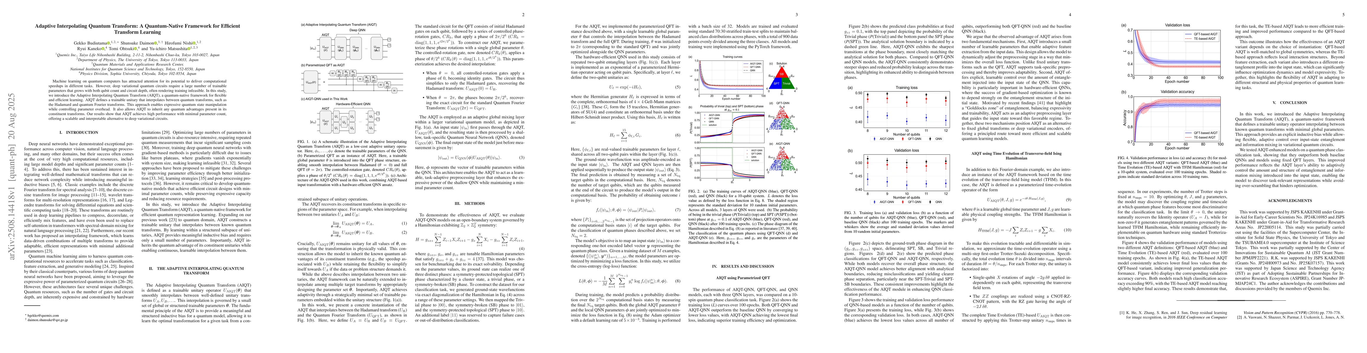 The research introduces the Adaptive Interpolating Quantum Transform (AIQT), a quantum-native framework for flexible and efficient learning of quantum transforms. AIQT is a trainable unitary that interpolates between known quantum transforms, such as the Hadamard and quantum Fourier transforms, with minimal global parameters, enabling expressive quantum state manipulation while controlling parameter overhead.