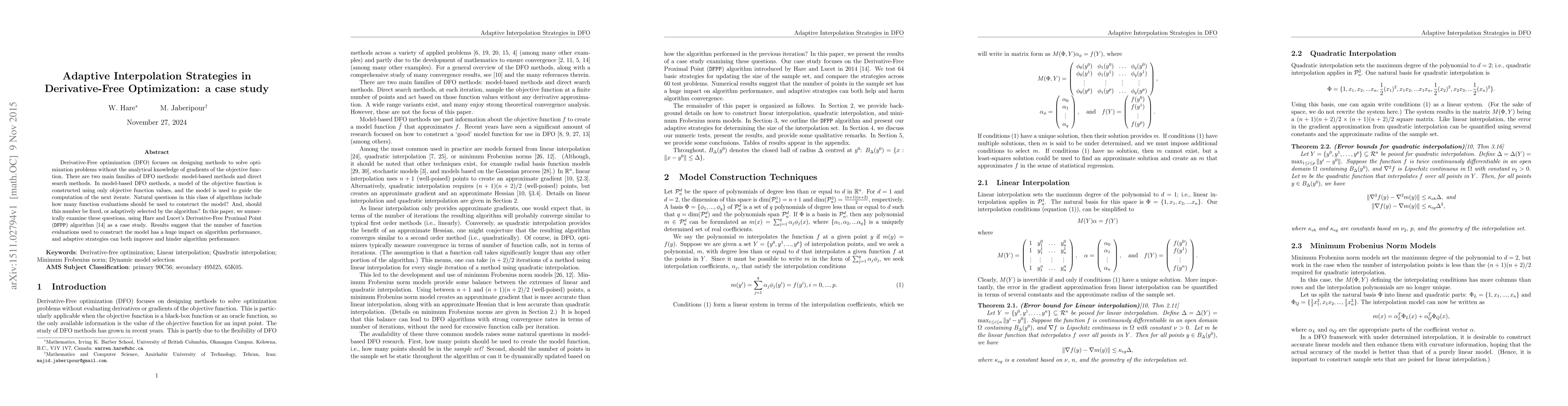 This paper investigates adaptive interpolation strategies in derivative-free optimization (DFO) using the DFPP algorithm as a case study. Findings indicate that the number of function evaluations for model construction significantly impacts performance, with adaptive strategies showing both potential benefits and drawbacks.