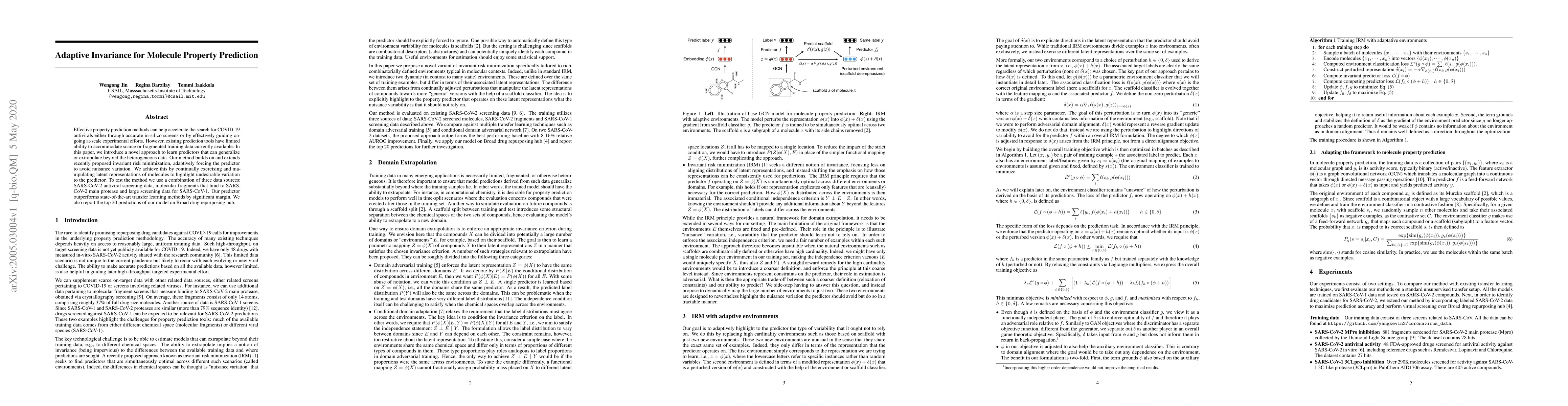Effective property prediction methods can help accelerate the search for COVID-19 antivirals either through accurate in-silico screens or by effectively guiding on-going at-scale experimental efforts. However, existing prediction tools have limited ability to accommodate scarce or fragmented training data currently available. In this paper, we introduce a novel approach to learn predictors that can generalize or extrapolate beyond the heterogeneous data. Our method builds on and extends recently proposed invariant risk minimization, adaptively forcing the predictor to avoid nuisance variation. We achieve this by continually exercising and manipulating latent representations of molecules to highlight undesirable variation to the predictor. To test the method we use a combination of three data sources: SARS-CoV-2 antiviral screening data, molecular fragments that bind to SARS-CoV-2 main protease and large screening data for SARS-CoV-1. Our predictor outperforms state-of-the-art transfer learning methods by significant margin. We also report the top 20 predictions of our model on Broad drug repurposing hub.