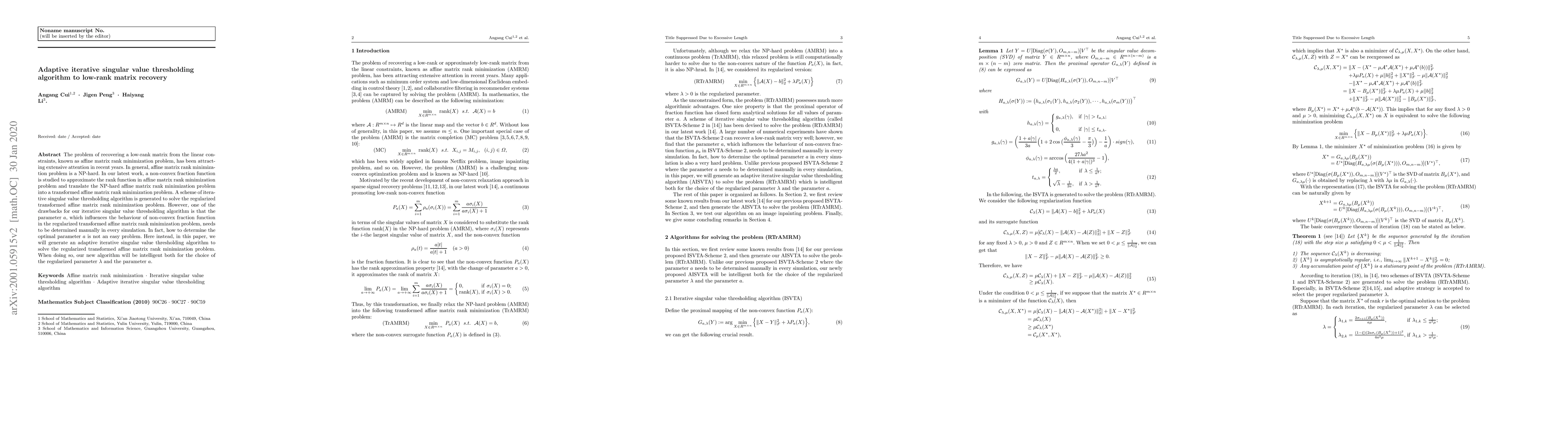 This paper proposes an adaptive iterative singular value thresholding algorithm to address the NP-hard affine matrix rank minimization problem by transforming it into a regularized form. The new algorithm intelligently determines both the regularization parameter and the adaptive parameter $a$, eliminating the need for manual parameter tuning in each simulation.