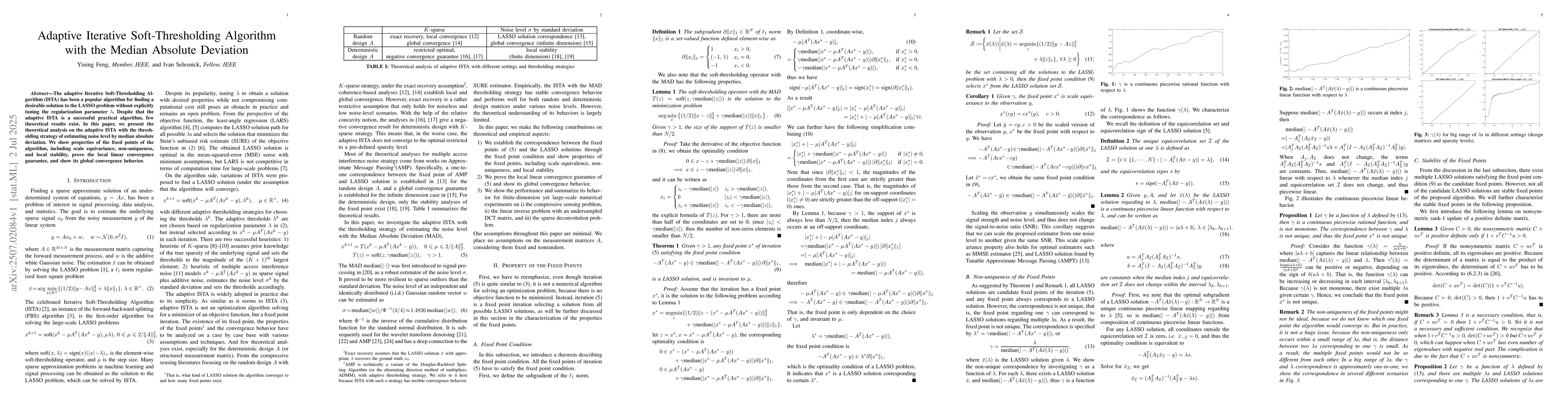 The adaptive Iterative Soft-Thresholding Algorithm (ISTA) has been a popular algorithm for finding a desirable solution to the LASSO problem without explicitly tuning the regularization parameter $\lambda$. Despite that the adaptive ISTA is a successful practical algorithm, few theoretical results exist. In this paper, we present the theoretical analysis on the adaptive ISTA with the thresholding strategy of estimating noise level by median absolute deviation. We show properties of the fixed points of the algorithm, including scale equivariance, non-uniqueness, and local stability, prove the local linear convergence guarantee, and show its global convergence behavior.