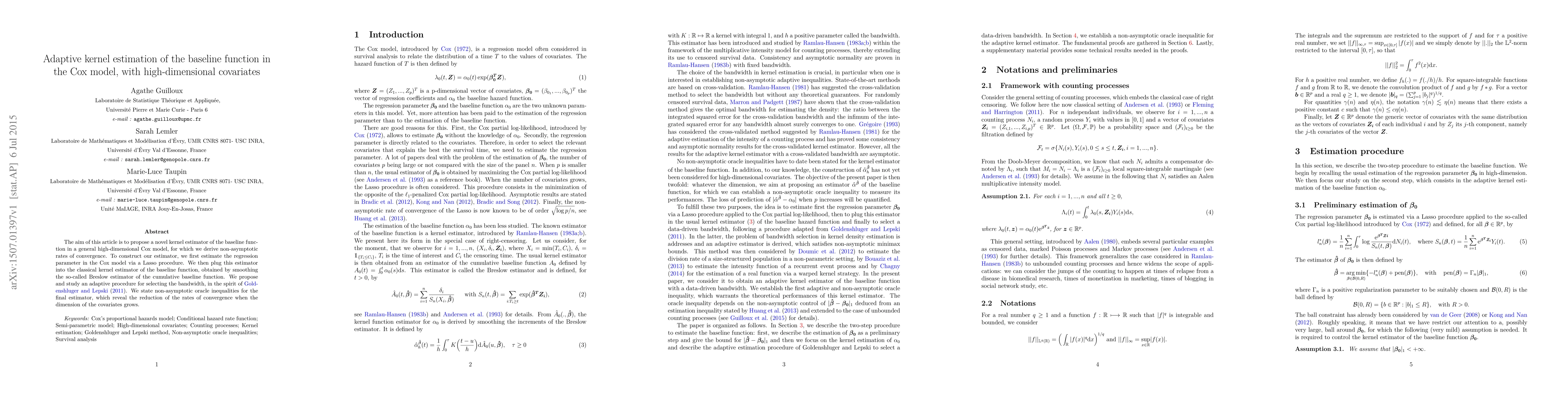This paper proposes a novel kernel estimator for the baseline function in high-dimensional Cox models, integrating Lasso for parameter estimation and adaptive bandwidth selection. It provides non-asymptotic convergence rates and oracle inequalities, highlighting the impact of covariate dimensionality on performance.