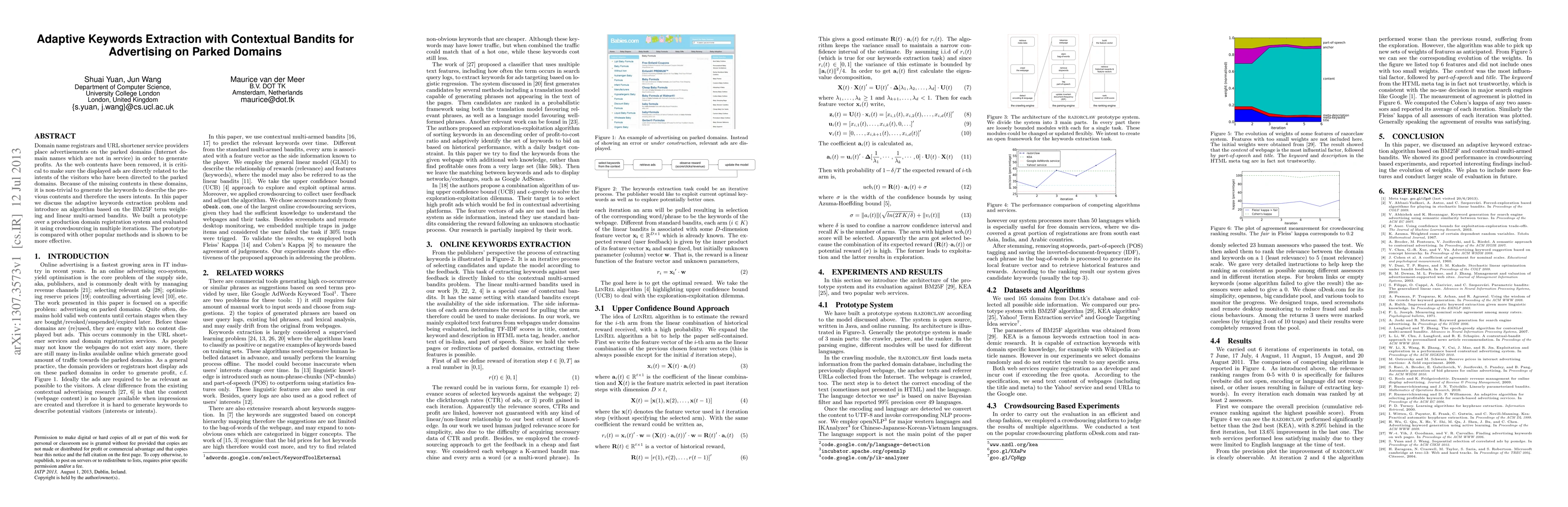 Domain name registrars and URL shortener service providers place advertisements on the parked domains (Internet domain names which are not in service) in order to generate profits. As the web contents have been removed, it is critical to make sure the displayed ads are directly related to the intents of the visitors who have been directed to the parked domains. Because of the missing contents in these domains, it is non-trivial to generate the keywords to describe the previous contents and therefore the users intents. In this paper we discuss the adaptive keywords extraction problem and introduce an algorithm based on the BM25F term weighting and linear multi-armed bandits. We built a prototype over a production domain registration system and evaluated it using crowdsourcing in multiple iterations. The prototype is compared with other popular methods and is shown to be more effective.