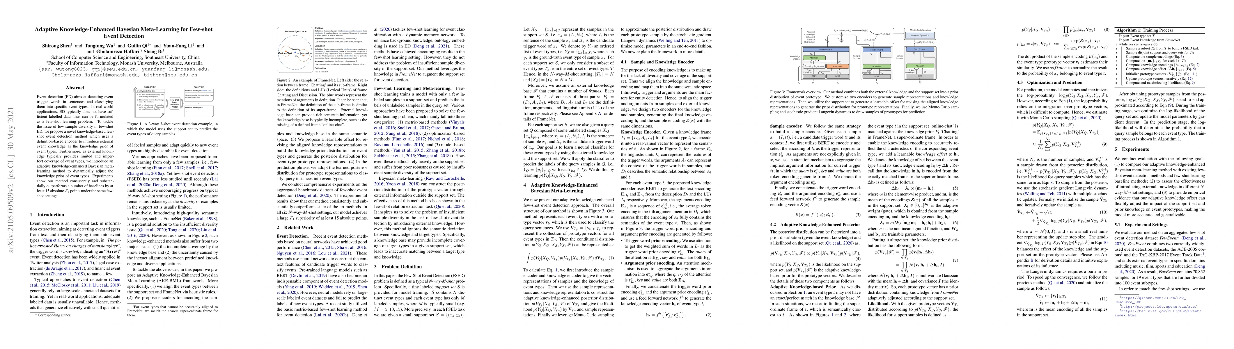 The paper proposes an adaptive knowledge-enhanced Bayesian meta-learning method for few-shot event detection, using a definition-based encoder to incorporate external event knowledge and dynamically adjusting this prior. Experiments demonstrate significant improvements over baselines by at least 15 F1 points.