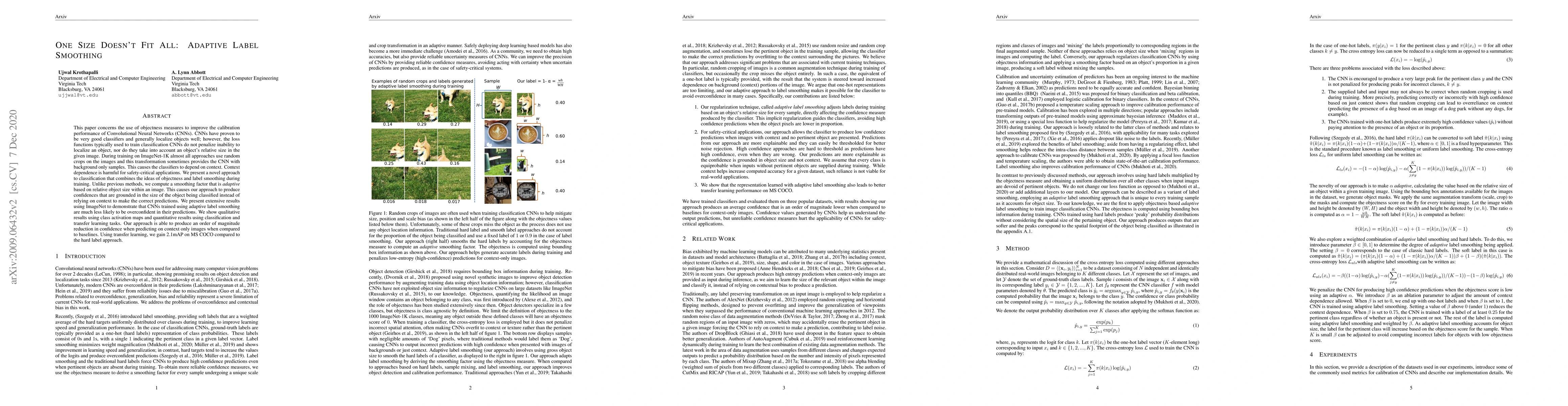 This paper concerns the use of objectness measures to improve the calibration performance of Convolutional Neural Networks (CNNs). CNNs have proven to be very good classifiers and generally localize objects well; however, the loss functions typically used to train classification CNNs do not penalize inability to localize an object, nor do they take into account an object's relative size in the given image. During training on ImageNet-1K almost all approaches use random crops on the images and this transformation sometimes provides the CNN with background only samples. This causes the classifiers to depend on context. Context dependence is harmful for safety-critical applications. We present a novel approach to classification that combines the ideas of objectness and label smoothing during training. Unlike previous methods, we compute a smoothing factor that is \emph{adaptive} based on relative object size within an image. This causes our approach to produce confidences that are grounded in the size of the object being classified instead of relying on context to make the correct predictions. We present extensive results using ImageNet to demonstrate that CNNs trained using adaptive label smoothing are much less likely to be overconfident in their predictions. We show qualitative results using class activation maps and quantitative results using classification and transfer learning tasks. Our approach is able to produce an order of magnitude reduction in confidence when predicting on context only images when compared to baselines. Using transfer learning, we gain 2.1mAP on MS COCO compared to the hard label approach.