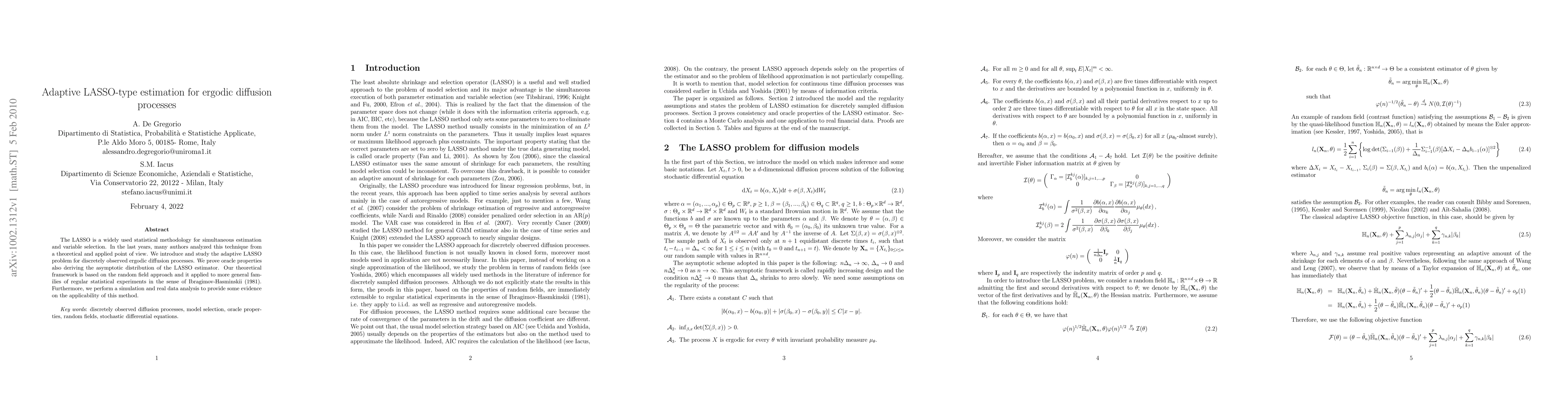 This paper introduces an adaptive LASSO method for estimating parameters in ergodic diffusion processes, proving oracle properties and asymptotic distribution. The approach is theoretically grounded in the random field method and validated through simulations and real data analysis.