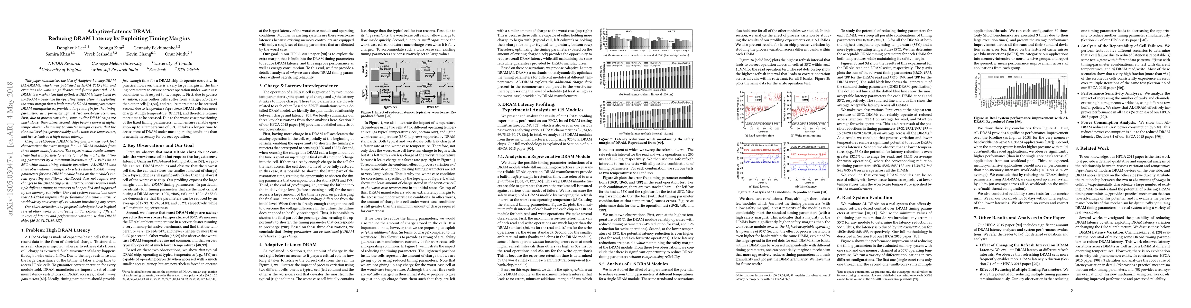 This paper summarizes the idea of Adaptive-Latency DRAM (AL-DRAM), which was published in HPCA 2015, and examines the work's significance and future potential. AL-DRAM is a mechanism that optimizes DRAM latency based on the DRAM module and the operating temperature, by exploiting the extra margin that is built into the DRAM timing parameters. DRAM manufacturers provide a large margin for the timing parameters as a provision against two worst-case scenarios. First, due to process variation, some outlier DRAM chips are much slower than others. Second, chips become slower at higher temperatures. The timing parameter margin ensures that the slow outlier chips operate reliably at the worst-case temperature, and hence leads to a high access latency. Using an FPGA-based DRAM testing platform, our work first characterizes the extra margin for 115 DRAM modules from three major manufacturers. The experimental results demonstrate that it is possible to reduce four of the most critical timing parameters by a minimum/maximum of 17.3%/54.8% at 55C while maintaining reliable operation. AL-DRAM uses these observations to adaptively select reliable DRAM timing parameters for each DRAM module based on the module's current operating conditions. AL-DRAM does not require any changes to the DRAM chip or its interface; it only requires multiple different timing parameters to be specified and supported by the memory controller. Our real system evaluations show that AL-DRAM improves the performance of memory-intensive workloads by an average of 14% without introducing any errors. Our characterization and proposed techniques have inspired several other works on analyzing and/or exploiting different sources of latency and performance variation within DRAM chips.