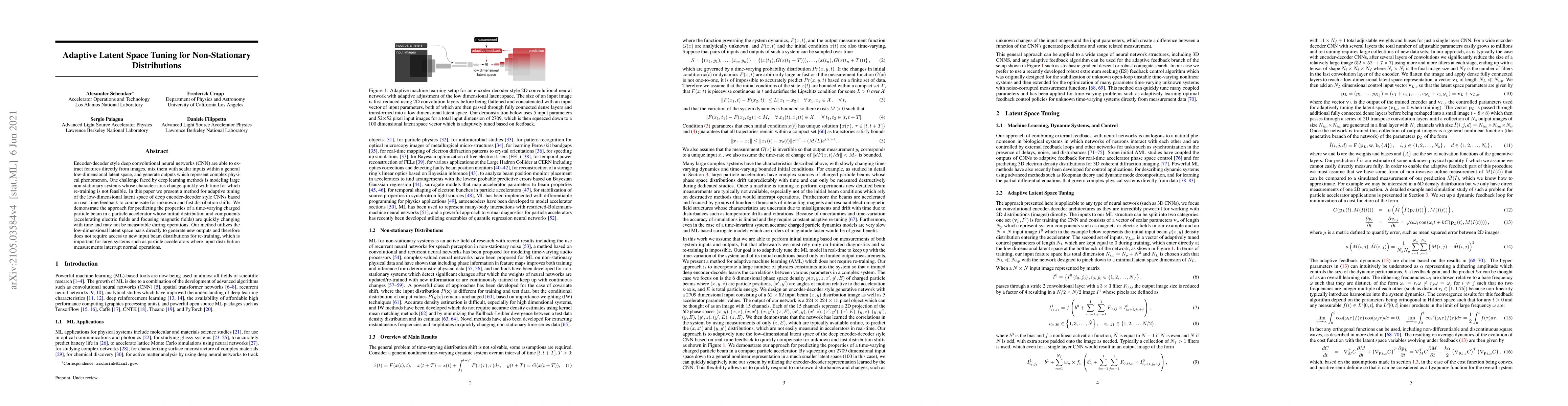 Powerful deep learning tools, such as convolutional neural networks (CNN), are able to learn the input-output relationships of large complicated systems directly from data. Encoder-decoder deep CNNs are able to extract features directly from images, mix them with scalar inputs within a general low-dimensional latent space, and then generate new complex 2D outputs which represent complex physical phenomenon. One important challenge faced by deep learning methods is large non-stationary systems whose characteristics change quickly with time for which re-training is not feasible. In this paper we present a method for adaptive tuning of the low-dimensional latent space of deep encoder-decoder style CNNs based on real-time feedback to quickly compensate for unknown and fast distribution shifts. We demonstrate our approach for predicting the properties of a time-varying charged particle beam in a particle accelerator whose components (accelerating electric fields and focusing magnetic fields) are also quickly changing with time.
