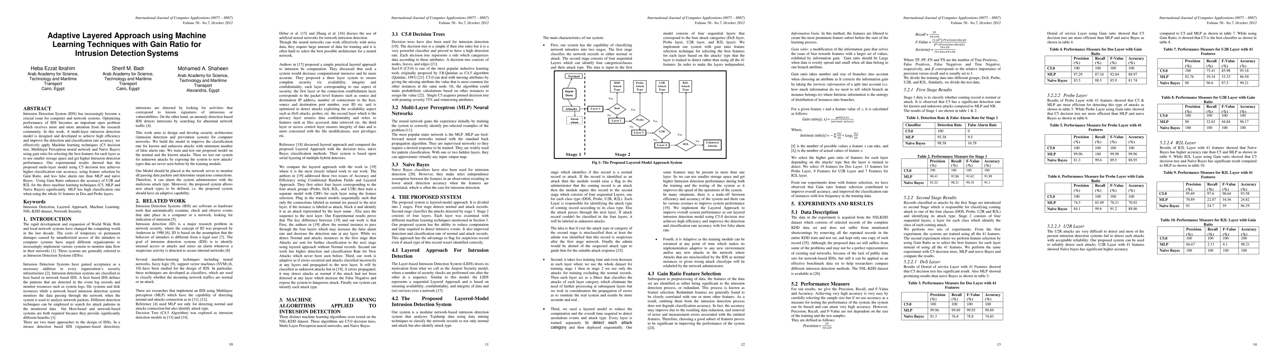 This paper proposes a multi-layer intrusion detection model utilizing machine learning techniques (C5, MLP, and Naive Bayes) with feature selection via Gain Ratio to enhance detection efficiency and accuracy. Experimental results indicate that the C5 decision tree layer achieves superior classification accuracy and lower false alarm rates compared to MLP and Naive Bayes, especially when using Gain Ratio for feature selection.
