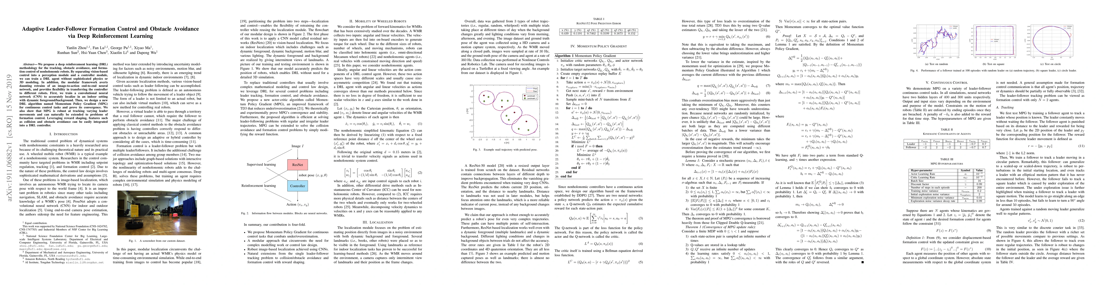 This paper proposes a deep reinforcement learning approach for adaptive leader-follower formation control and obstacle avoidance in nonholonomic robots, utilizing a modular framework that separates perception and control, thus enabling flexible transfer to different robots and robust tracking of dynamic environments. The Momentum Policy Gradient (MPG) algorithm is introduced for continuous control and is shown to be effective in formation control and obstacle avoidance through reward shaping.