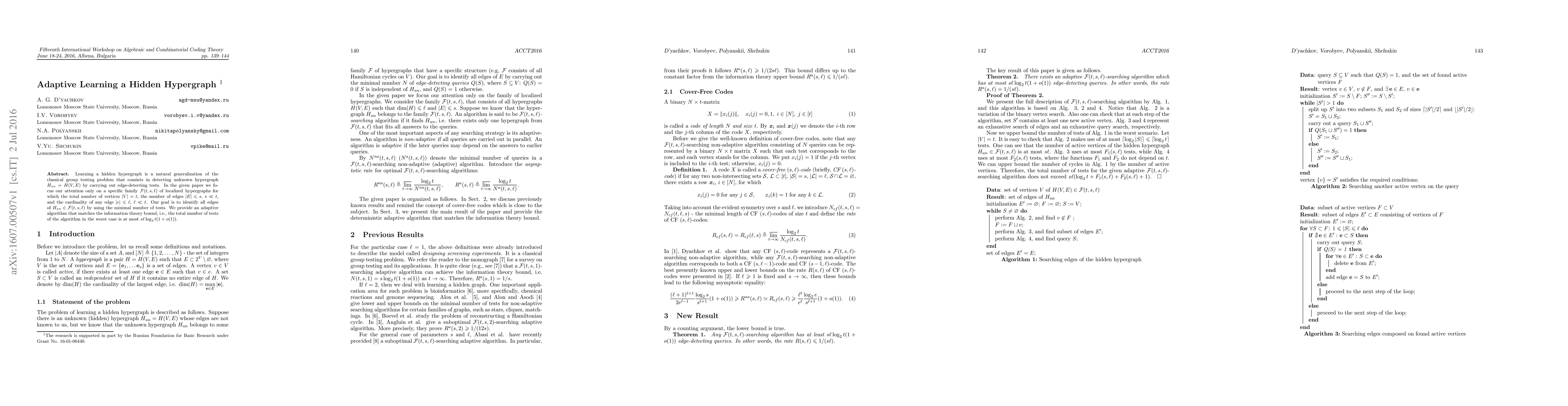 Learning a hidden hypergraph is a natural generalization of the classical group testing problem that consists in detecting unknown hypergraph $H_{un}=H(V,E)$ by carrying out edge-detecting tests. In the given paper we focus our attention only on a specific family $\mathcal{F}(t,s,\ell)$ of localized hypergraphs for which the total number of vertices $|V| = t$, the number of edges $|E|\le s$, $s\ll t$, and the cardinality of any edge $|e|\le\ell$, $\ell\ll t$. Our goal is to identify all edges of $H_{un}\in \mathcal{F}(t,s,\ell)$ by using the minimal number of tests. We provide an adaptive algorithm that matches the information theory bound, i.e., the total number of tests of the algorithm in the worst case is at most $s\ell\log_2 t(1+o(1))$.