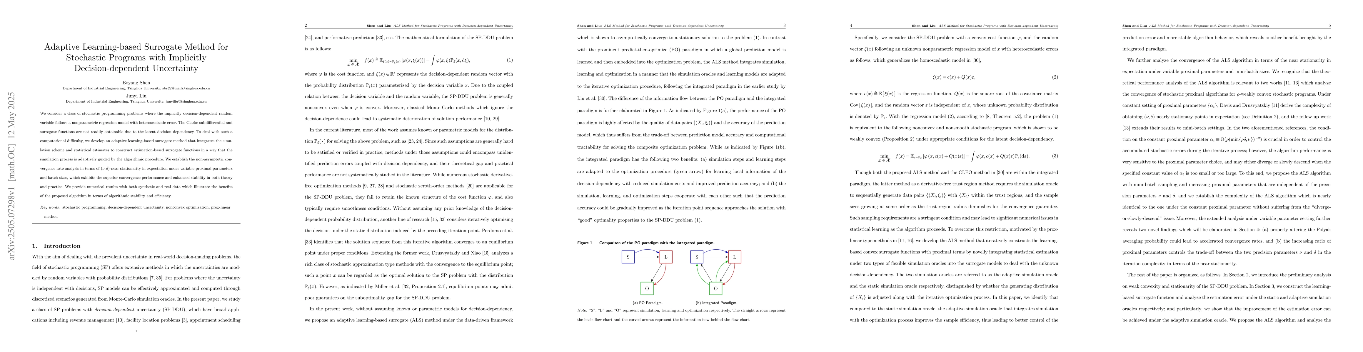 The paper develops an adaptive learning-based surrogate method for stochastic programming problems with implicitly decision-dependent uncertainty, integrating simulation schemes and statistical estimates to construct estimation-based surrogate functions adaptively guided by the algorithmic procedure.