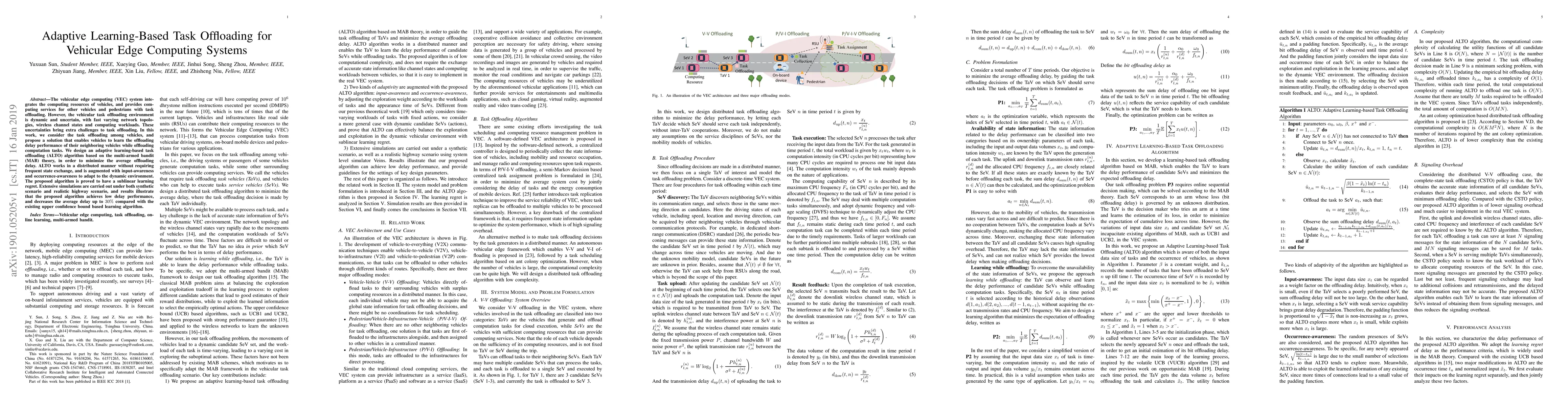 This paper proposes an adaptive learning-based task offloading (ALTO) algorithm for vehicular edge computing to minimize average offloading delay. The ALTO algorithm leverages multi-armed bandit theory and is shown to achieve sublinear learning regret, reducing average delay by up to 30% compared to existing methods.