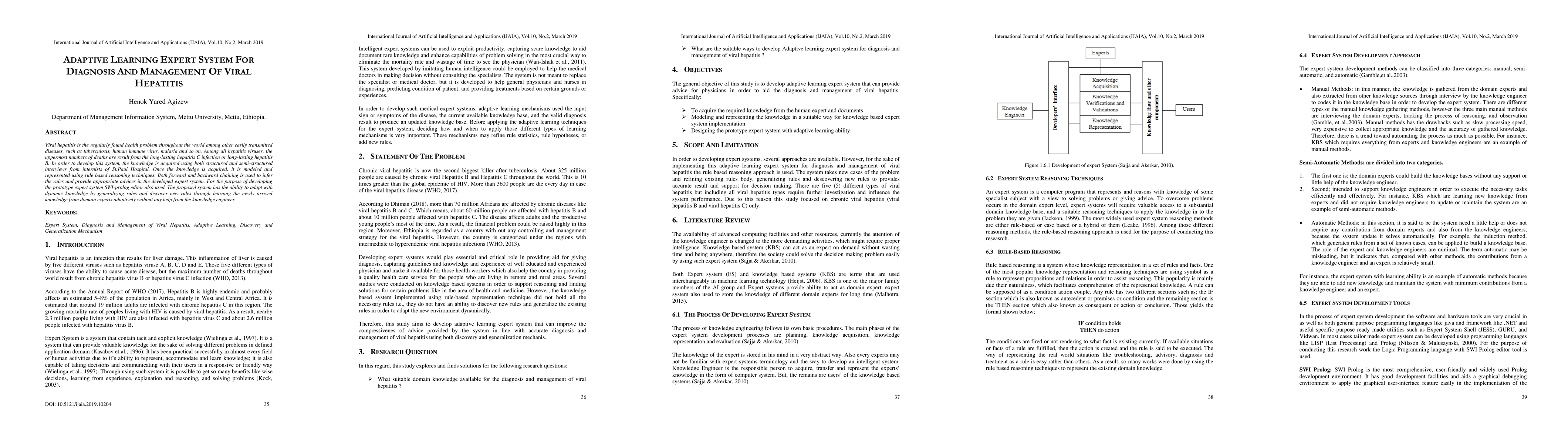 This paper presents an adaptive learning expert system for diagnosing and managing viral hepatitis, utilizing knowledge from internists to model rule-based reasoning. The system employs forward and backward chaining, and uses SWI-prolog for prototyping, with the capability to dynamically adapt by generalizing and discovering new rules from domain experts.