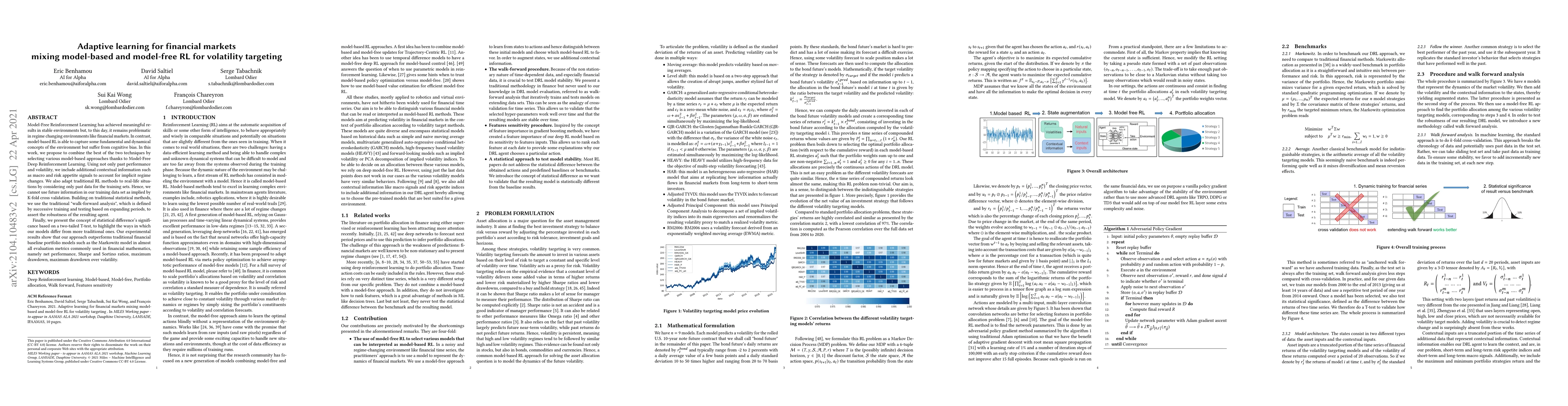 This paper proposes a hybrid approach combining model-based and model-free reinforcement learning to develop an adaptive learning agent for volatility targeting in financial markets. The method incorporates contextual information and adapts traditional reinforcement learning techniques to real-life scenarios, demonstrating superior performance over traditional portfolio models in various financial metrics.