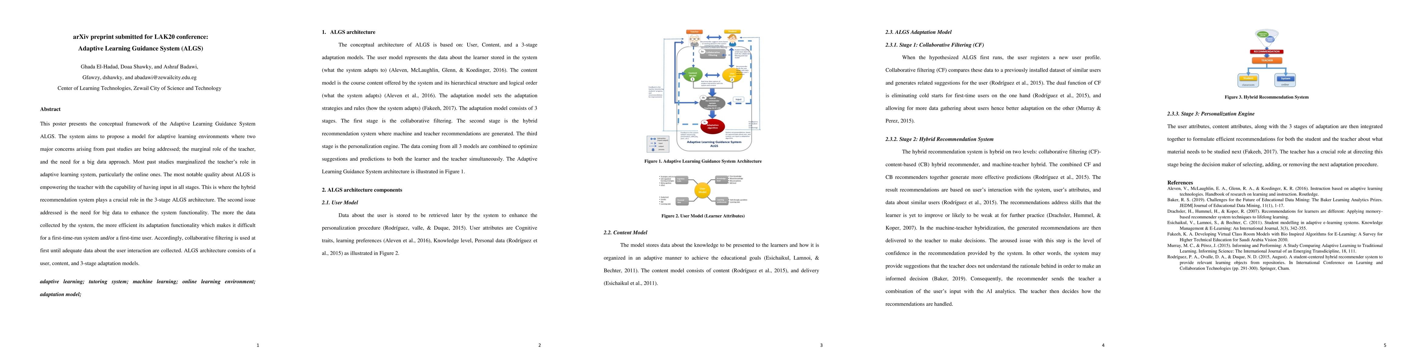 This poster presents the conceptual framework of the Adaptive Learning Guidance System ALGS. The system aims to propose a model for adaptive learning environments where two major concerns arising from past studies are being addressed; the marginal role of the teacher, and the need for a big data approach. Most past studies marginalized the teacher role in adaptive learning system, particularly the online ones. The most notable quality about ALGS is empowering the teacher with the capability of having input in all stages. This is where the hybrid recommendation system plays a crucial role in the 3-stage ALGS architecture. The second issue addressed is the need for big data to enhance the system functionality. The more the data collected by the system, the more efficient its adaptation functionality which makes it difficult for a first-time-run system and (or) a first-time user. Accordingly, collaborative filtering is used at first until adequate data about the user interaction are collected. ALGS architecture consists of a user, content, and 3-stage adaptation models.