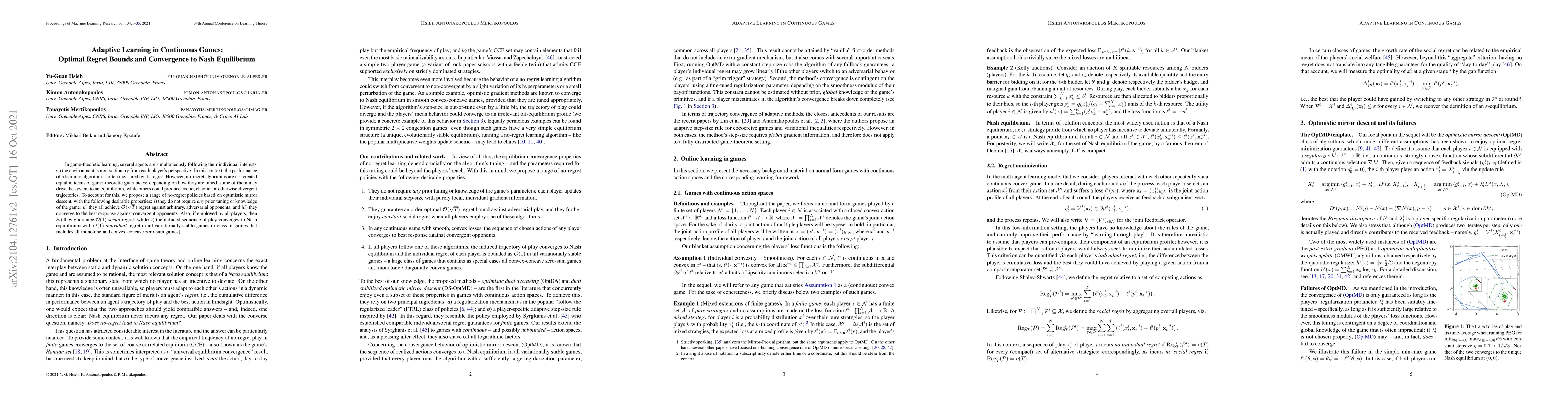 This paper proposes adaptive learning algorithms based on optimistic mirror descent for continuous games, achieving optimal O(\sqrt{T}) regret and convergence to Nash equilibrium under certain conditions, without requiring prior game knowledge.