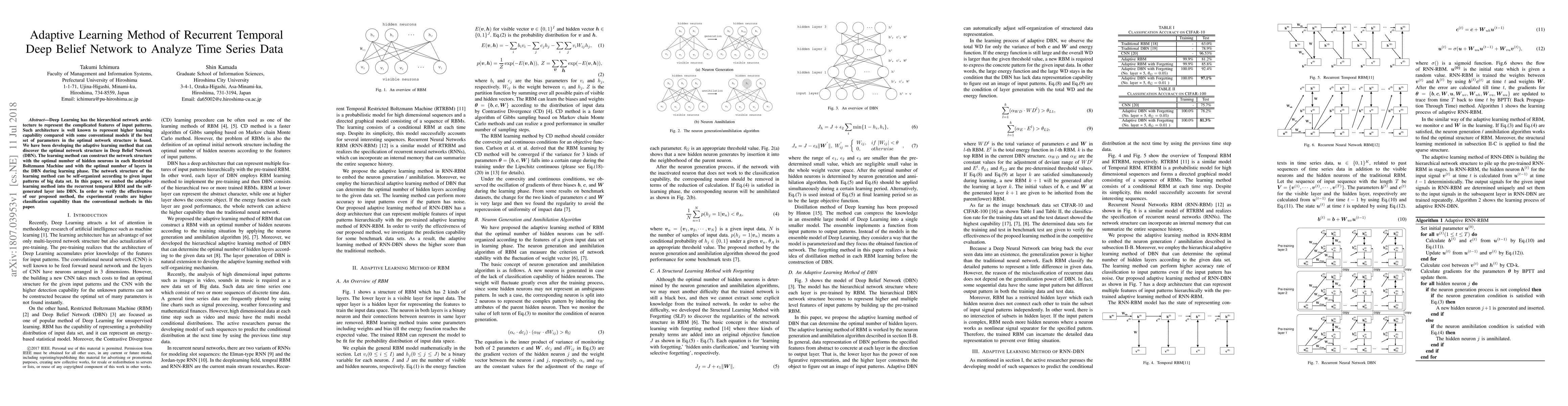 Deep Learning has the hierarchical network architecture to represent the complicated features of input patterns. Such architecture is well known to represent higher learning capability compared with some conventional models if the best set of parameters in the optimal network structure is found. We have been developing the adaptive learning method that can discover the optimal network structure in Deep Belief Network (DBN). The learning method can construct the network structure with the optimal number of hidden neurons in each Restricted Boltzmann Machine and with the optimal number of layers in the DBN during learning phase. The network structure of the learning method can be self-organized according to given input patterns of big data set. In this paper, we embed the adaptive learning method into the recurrent temporal RBM and the self-generated layer into DBN. In order to verify the effectiveness of our proposed method, the experimental results are higher classification capability than the conventional methods in this paper.