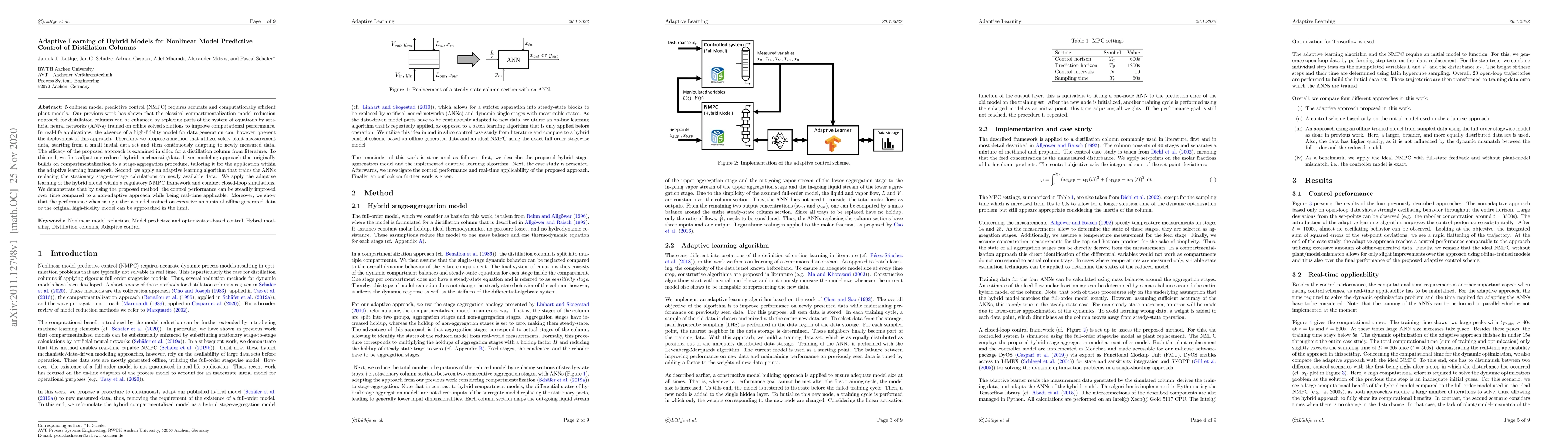 Nonlinear model predictive control (NMPC) requires accurate and computationally efficient plant models. Our previous work has shown that the classical compartmentalization model reduction approach for distillation columns can be enhanced by replacing parts of the system of equations by artificial neural networks (ANNs) trained on offline solved solutions to improve computational performance. In real-life applications, the absence of a high-fidelity model for data generation can, however, prevent the deployment of this approach. Therefore, we propose a method that utilizes solely plant measurement data, starting from a small initial data set and then continuously adapting to newly measured data. The efficacy of the proposed approach is examined in silico for a distillation column from literature. To this end, we first adjust our reduced hybrid mechanistic/data-driven modeling approach that originally builds on compartmentalization to a stage-aggregation procedure, tailoring it for the application within the adaptive learning framework. Second, we apply an adaptive learning algorithm that trains the ANNs replacing the stationary stage-to-stage calculations on newly available data. We apply the adaptive learning of the hybrid model within a regulatory NMPC framework and conduct closed-loop simulations. We demonstrate that by using the proposed method, the control performance can be steadily improved over time compared to a non-adaptive approach while being real-time applicable. Moreover, we show that the performance when using either a model trained on excessive amounts of offline generated data or the original high-fidelity model can be approached in the limit.
