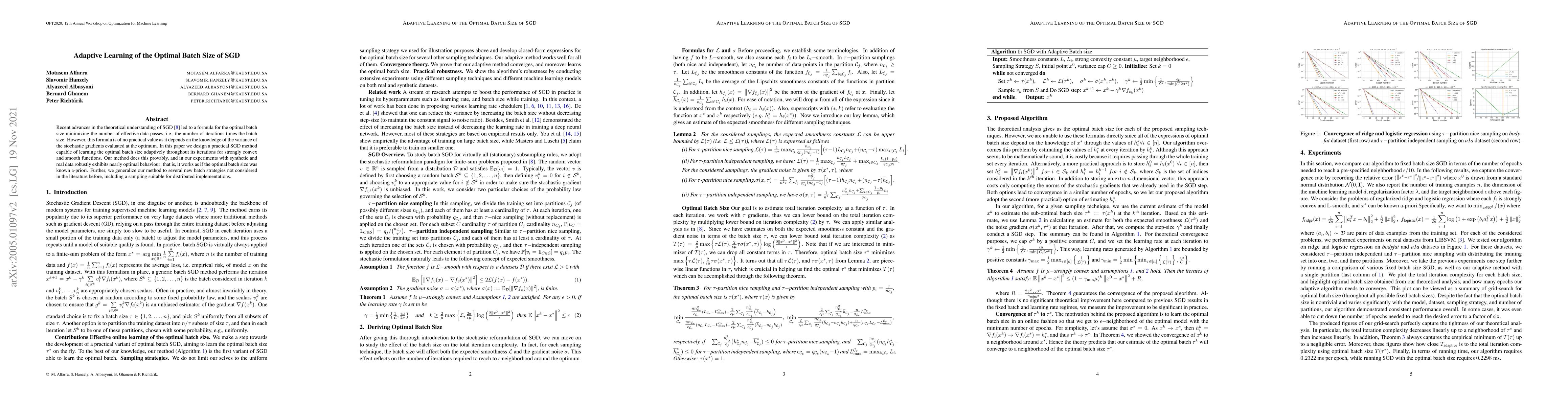 Recent advances in the theoretical understanding of SGD led to a formula for the optimal batch size minimizing the number of effective data passes, i.e., the number of iterations times the batch size. However, this formula is of no practical value as it depends on the knowledge of the variance of the stochastic gradients evaluated at the optimum. In this paper we design a practical SGD method capable of learning the optimal batch size adaptively throughout its iterations for strongly convex and smooth functions. Our method does this provably, and in our experiments with synthetic and real data robustly exhibits nearly optimal behaviour; that is, it works as if the optimal batch size was known a-priori. Further, we generalize our method to several new batch strategies not considered in the literature before, including a sampling suitable for distributed implementations.