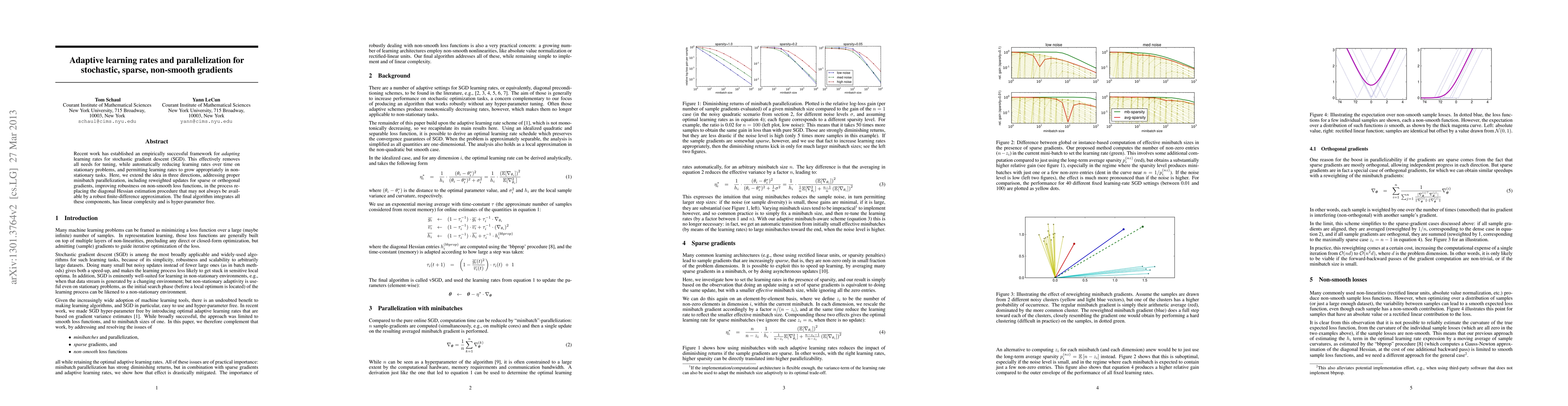 Recent work has established an empirically successful framework for adapting learning rates for stochastic gradient descent (SGD). This effectively removes all needs for tuning, while automatically reducing learning rates over time on stationary problems, and permitting learning rates to grow appropriately in non-stationary tasks. Here, we extend the idea in three directions, addressing proper minibatch parallelization, including reweighted updates for sparse or orthogonal gradients, improving robustness on non-smooth loss functions, in the process replacing the diagonal Hessian estimation procedure that may not always be available by a robust finite-difference approximation. The final algorithm integrates all these components, has linear complexity and is hyper-parameter free.