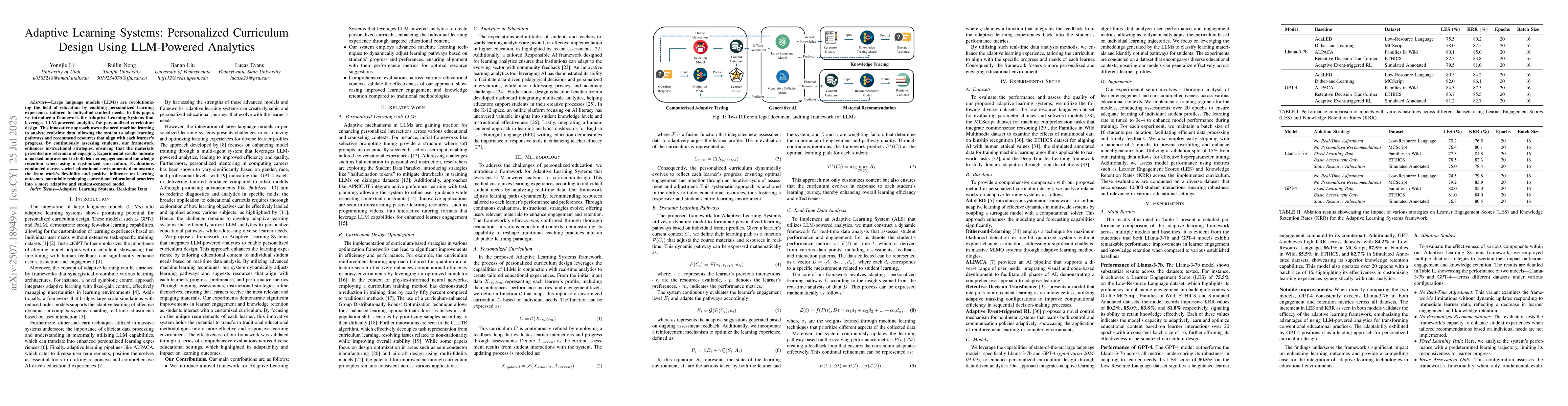 Large language models (LLMs) are revolutionizing the field of education by enabling personalized learning experiences tailored to individual student needs. In this paper, we introduce a framework for Adaptive Learning Systems that leverages LLM-powered analytics for personalized curriculum design. This innovative approach uses advanced machine learning to analyze real-time data, allowing the system to adapt learning pathways and recommend resources that align with each learner's progress. By continuously assessing students, our framework enhances instructional strategies, ensuring that the materials presented are relevant and engaging. Experimental results indicate a marked improvement in both learner engagement and knowledge retention when using a customized curriculum. Evaluations conducted across varied educational environments demonstrate the framework's flexibility and positive influence on learning outcomes, potentially reshaping conventional educational practices into a more adaptive and student-centered model.