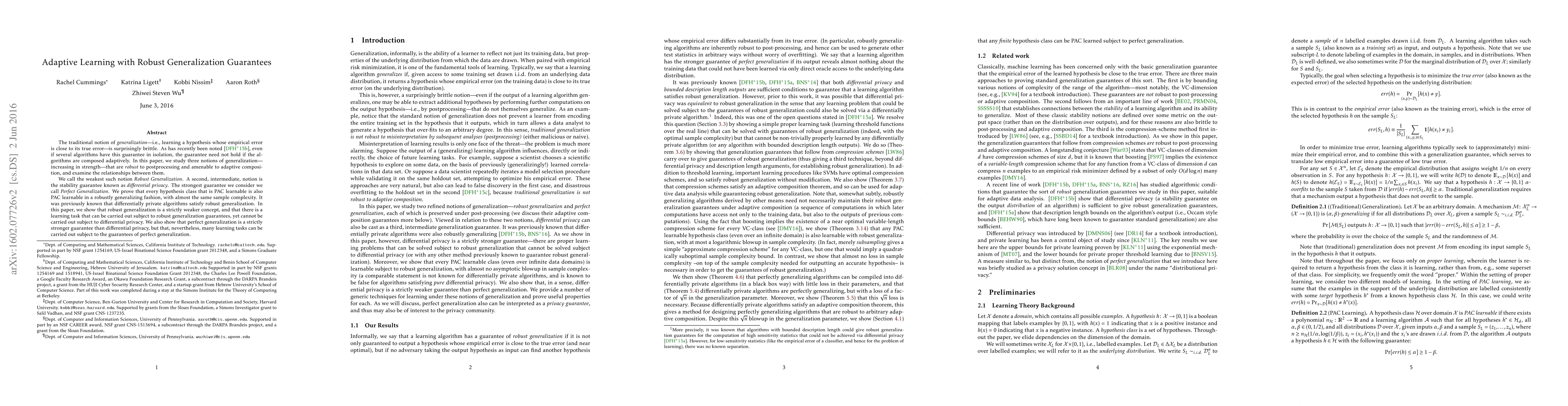 This paper explores three notions of generalization—Robust Generalization, differential privacy, and Perfect Generalization—that are robust to adaptive composition. It demonstrates that robust generalization is weaker than differential privacy, while perfect generalization is stronger, yet many tasks can achieve robust or perfect generalization.