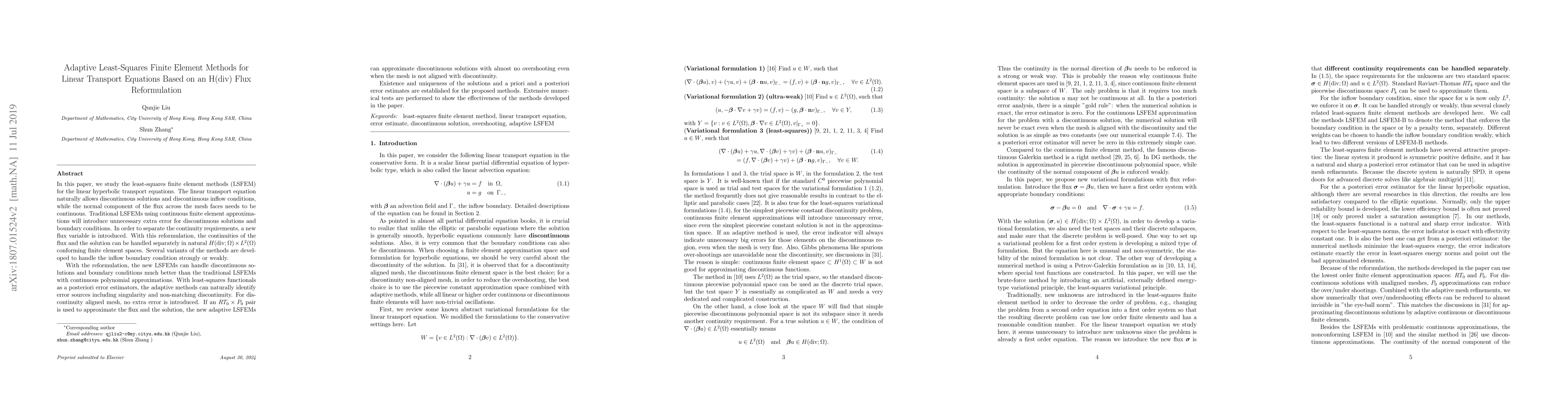 This paper proposes adaptive least-squares finite element methods (LSFEM) for linear transport equations using an $H(\mbox{div})$ flux reformulation, which better handles discontinuous solutions and boundary conditions. The reformulation allows separate treatment of flux continuity and solution continuity, improving accuracy over traditional methods.