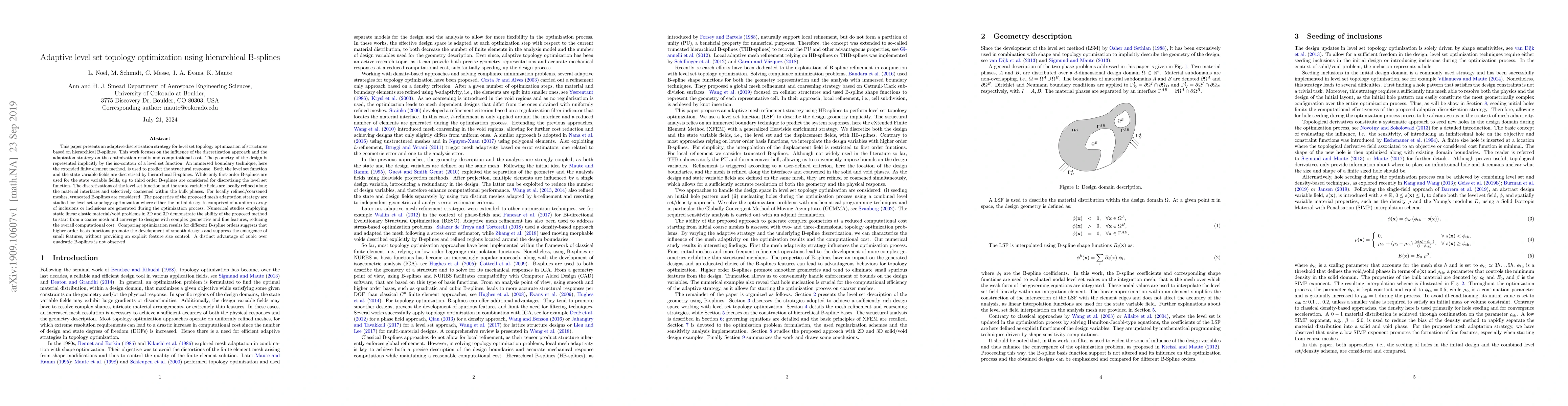 This paper introduces an adaptive level set topology optimization method using hierarchical B-splines, focusing on refining discretization near material interfaces and coarsening elsewhere to improve computational efficiency. Higher-order B-splines promote smoother designs but do not explicitly control feature size, with no significant advantage observed between cubic and quadratic B-splines.