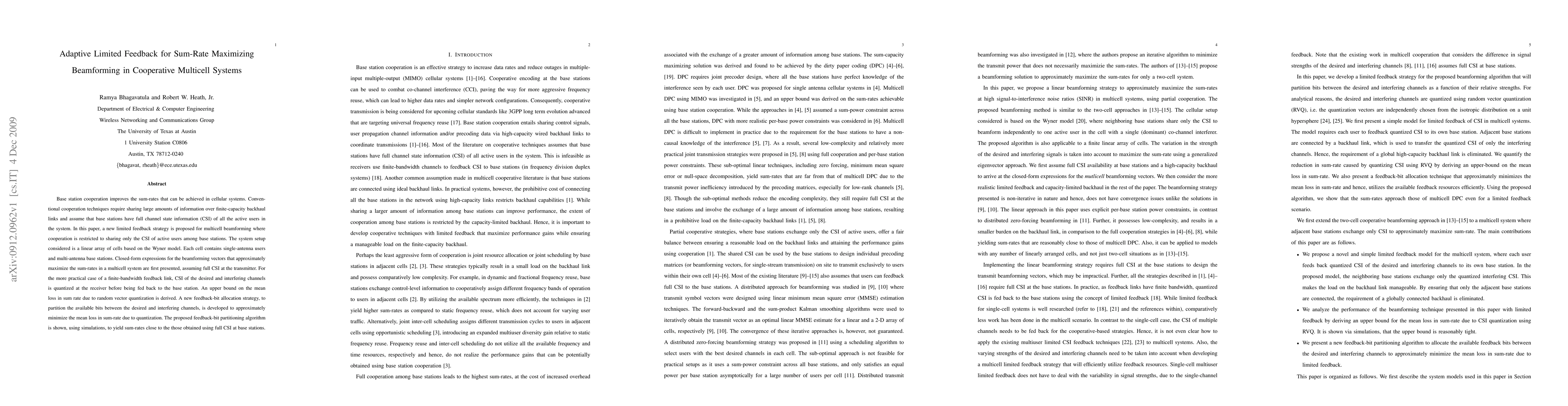 Base station cooperation improves the sum-rates that can be achieved in cellular systems. Conventional cooperation techniques require sharing large amounts of information over finite-capacity backhaul links and assume that base stations have full channel state information (CSI) of all the active users in the system. In this paper, a new limited feedback strategy is proposed for multicell beamforming where cooperation is restricted to sharing only the CSI of active users among base stations. The system setup considered is a linear array of cells based on the Wyner model. Each cell contains single-antenna users and multi-antenna base stations. Closed-form expressions for the beamforming vectors that approximately maximize the sum-rates in a multicell system are first presented, assuming full CSI at the transmitter. For the more practical case of a finite-bandwidth feedback link, CSI of the desired and interfering channels is quantized at the receiver before being fed back to the base station. An upper bound on the mean loss in sum rate due to random vector quantization is derived. A new feedback-bit allocation strategy, to partition the available bits between the desired and interfering channels, is developed to approximately minimize the mean loss in sum-rate due to quantization. The proposed feedback-bit partitioning algorithm is shown, using simulations, to yield sum-rates close to the those obtained using full CSI at base stations.