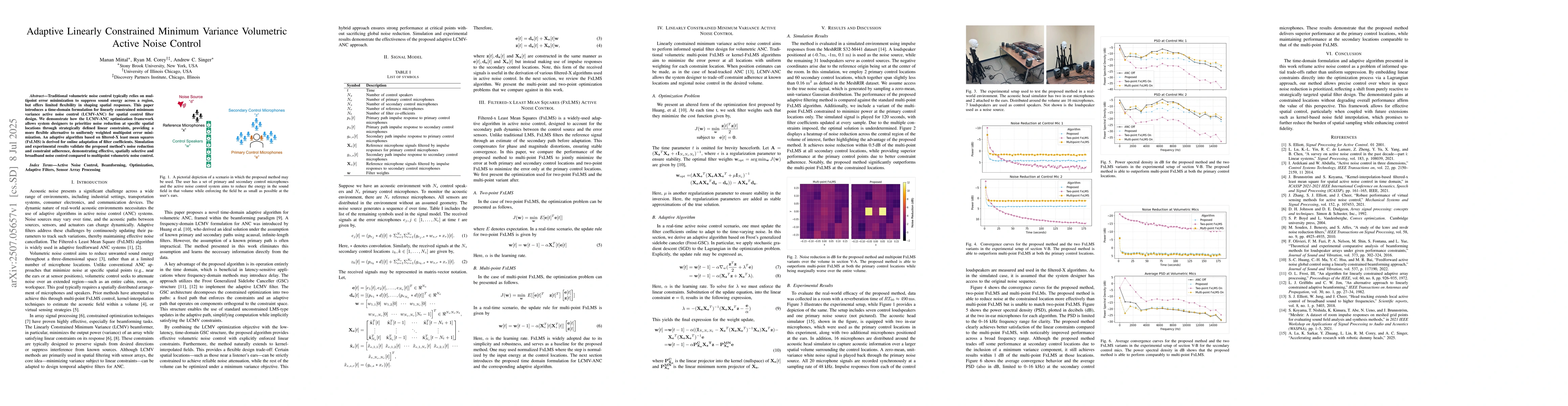 Traditional volumetric noise control typically relies on multipoint error minimization to suppress sound energy across a region, but offers limited flexibility in shaping spatial responses. This paper introduces a time-domain formulation for linearly constrained minimum variance active noise control (LCMV ANC) for spatial control filter design. We demonstrate how the LCMV ANC optimization framework allows system designers to prioritize noise reduction at specific spatial locations through strategically defined linear constraints, providing a more flexible alternative to uniformly weighted multipoint error minimization. An adaptive algorithm based on filtered-X least mean squares (FxLMS) is derived for online adaptation of filter coefficients. Simulation and experimental results validate the proposed method's noise reduction and constraint adherence, demonstrating effective, spatially selective, and broadband noise control compared to multipoint volumetric noise control.
