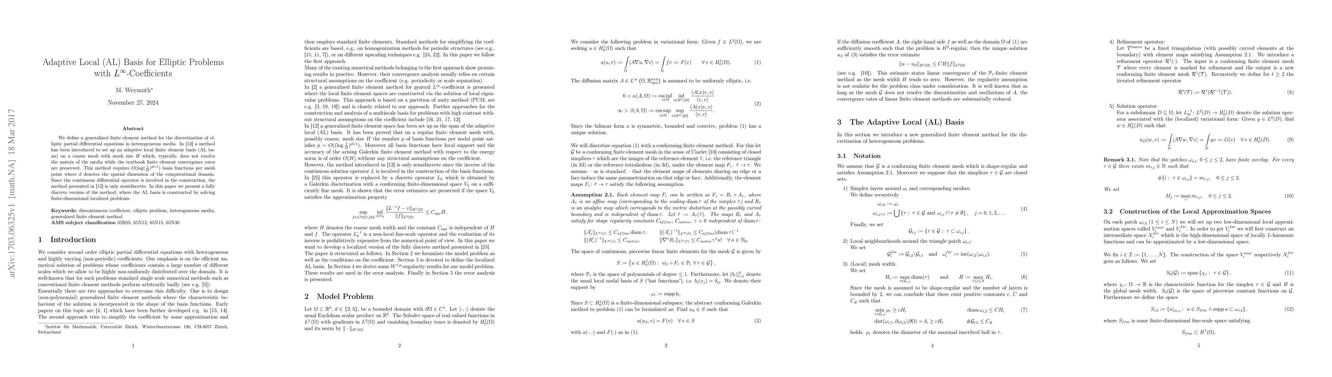We define a generalized finite element method for the discretization of elliptic partial differential equations in heterogeneous media. An adaptive local finite element basis (AL basis) on a coarse mesh which does not resolve the matrix of the media is constructed by solving finite-dimensional localized problems. The method requires $O(log(1/H)^{d+1})$ basis functions per mesh point. We prove that the optimal finite element convergence rates are preserved.
