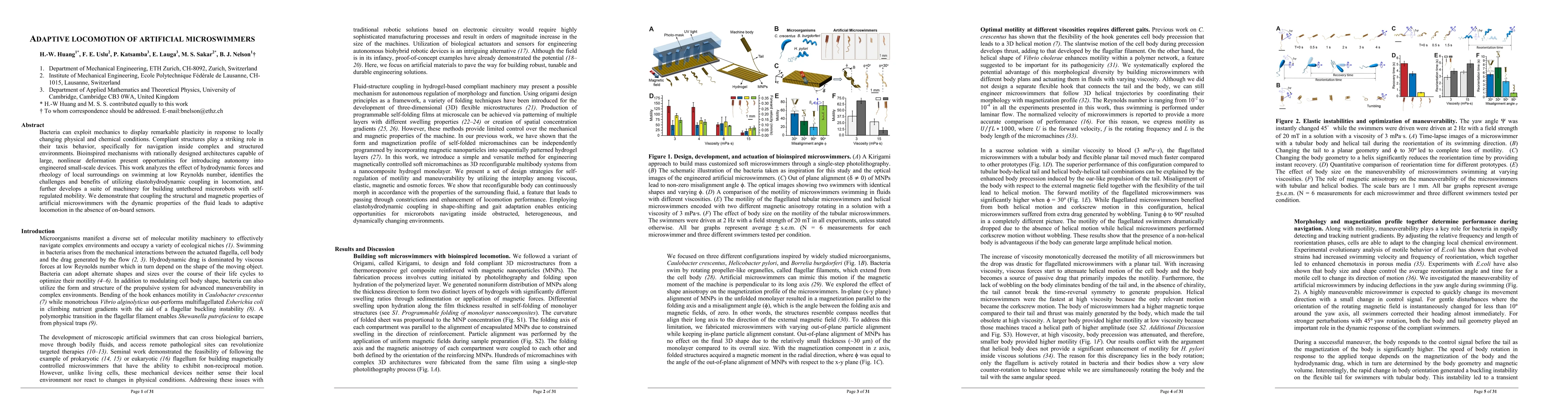 Bacteria can exploit mechanics to display remarkable plasticity in response to locally changing physical and chemical conditions. Compliant structures play a striking role in their taxis behavior, specifically for navigation inside complex and structured environments. Bioinspired mechanisms with rationally designed architectures capable of large, nonlinear deformation present opportunities for introducing autonomy into engineered small-scale devices. This work analyzes the effect of hydrodynamic forces and rheology of local surroundings on swimming at low Reynolds number, identifies the challenges and benefits of utilizing elastohydrodynamic coupling in locomotion, and further develops a suite of machinery for building untethered microrobots with self-regulated mobility. We demonstrate that coupling the structural and magnetic properties of artificial microswimmers with the dynamic properties of the fluid leads to adaptive locomotion in the absence of on-board sensors.