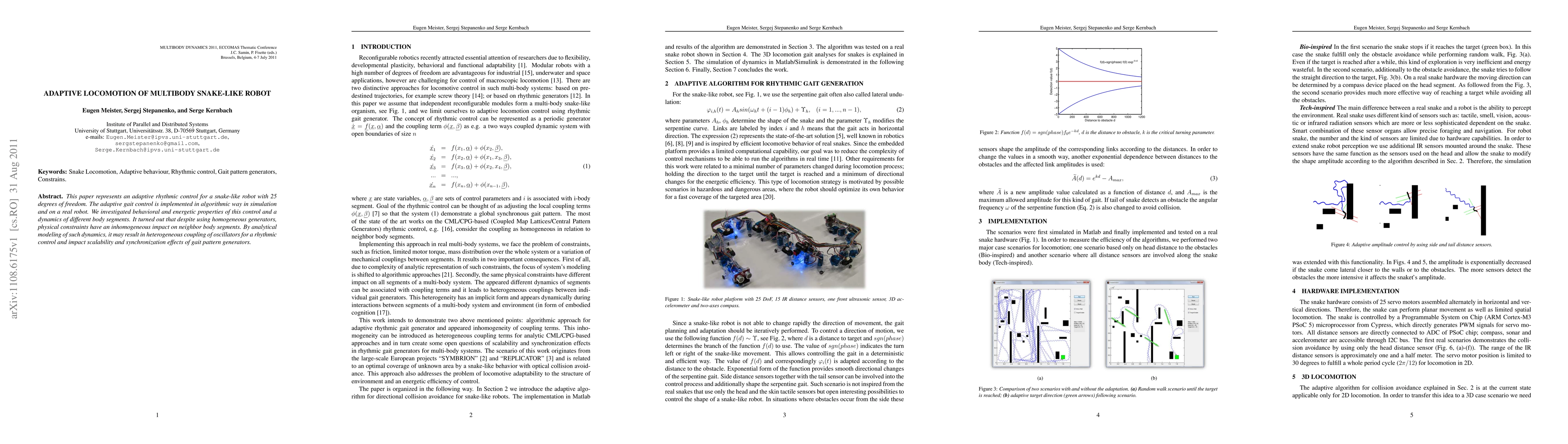 This paper represents an adaptive rhythmic control for a snake-like robot with 25 degrees of freedom. The adaptive gait control is implemented in algorithmic way in simulation and on a real robot. We investigated behavioral and energetic properties of this control and a dynamics of different body segments. It turned out that despite using homogeneous generators, physical constraints have an inhomogeneous impact on neighbor body segments. By analytical modeling of such dynamics, it may result in heterogeneous coupling of oscillators for a rhythmic control and impact scalability and synchronization effects of gait pattern generators.