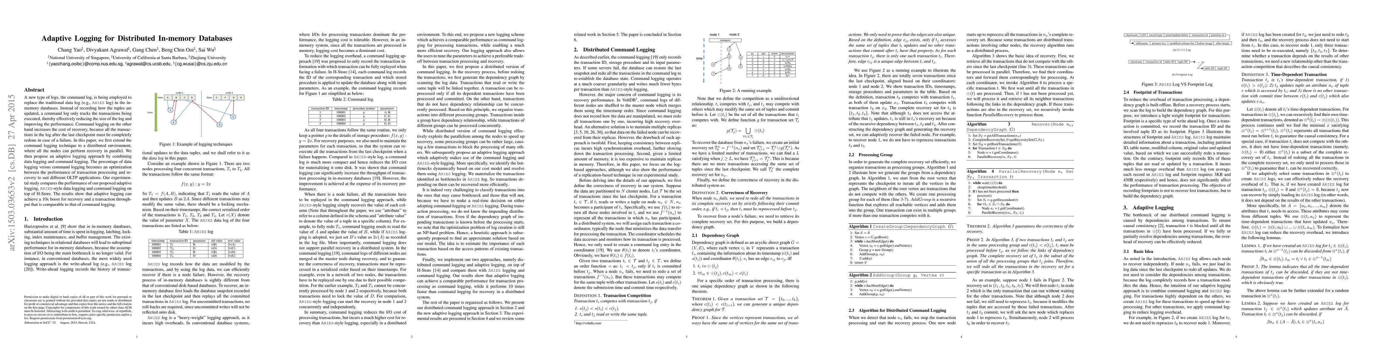 This paper introduces adaptive logging for distributed in-memory databases, employing command logs to reduce log size and improve performance while balancing recovery costs. The proposed adaptive logging approach combines command and data logging to optimize performance and recovery, achieving a 10x recovery boost and comparable transaction throughput to command logging.
