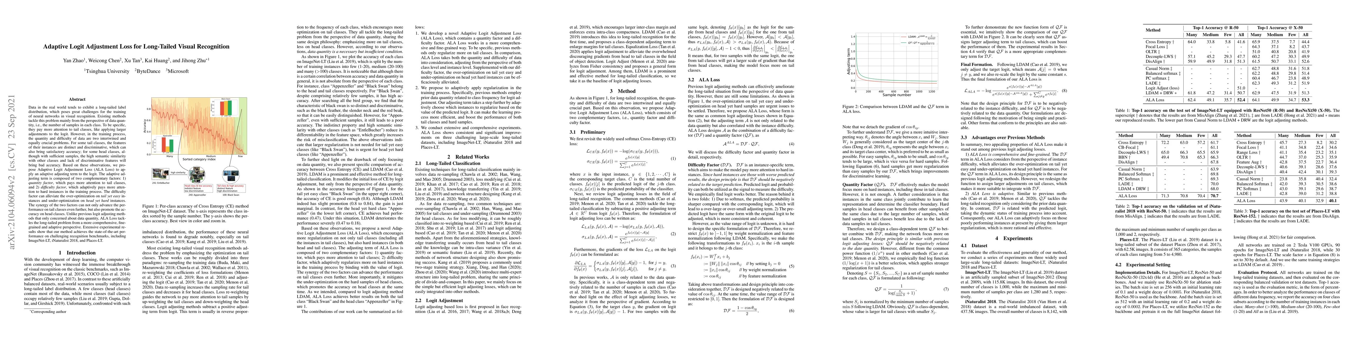 The paper proposes Adaptive Logit Adjustment Loss (ALA Loss) to address long-tailed visual recognition by considering both data quantity and difficulty. It combines a quantity factor for tail classes and a difficulty factor for hard instances, achieving state-of-the-art performance on benchmarks like ImageNet-LT and iNaturalist 2018.