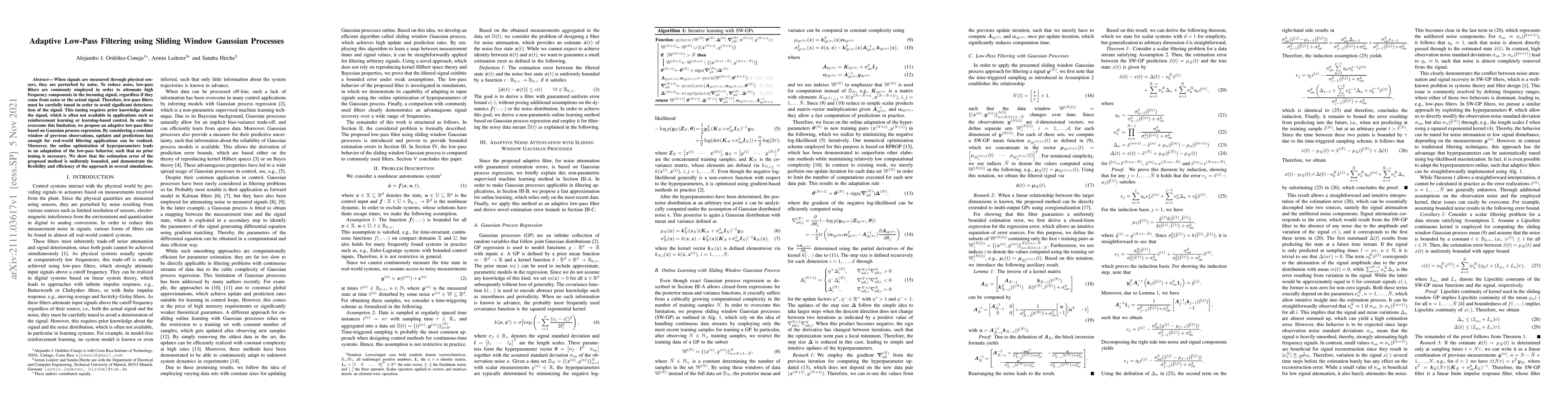 This paper proposes an adaptive low-pass filter using sliding window Gaussian processes to reduce noise in sensor signals without prior tuning. The method optimizes hyperparameters online, ensuring real-time filtering and bounded estimation error, demonstrated through effective simulations.