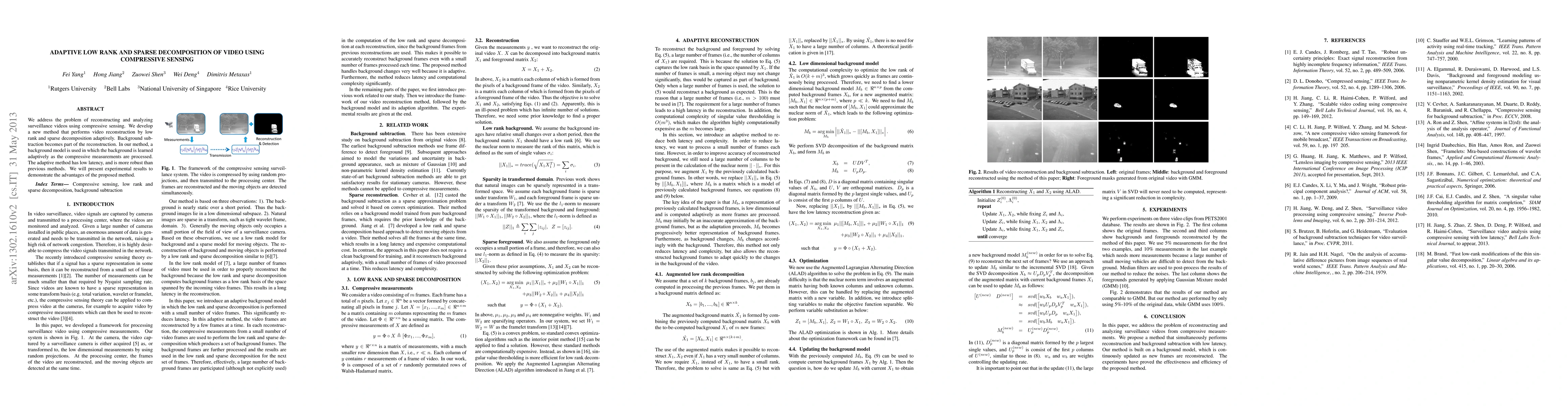 We address the problem of reconstructing and analyzing surveillance videos using compressive sensing. We develop a new method that performs video reconstruction by low rank and sparse decomposition adaptively. Background subtraction becomes part of the reconstruction. In our method, a background model is used in which the background is learned adaptively as the compressive measurements are processed. The adaptive method has low latency, and is more robust than previous methods. We will present experimental results to demonstrate the advantages of the proposed method.