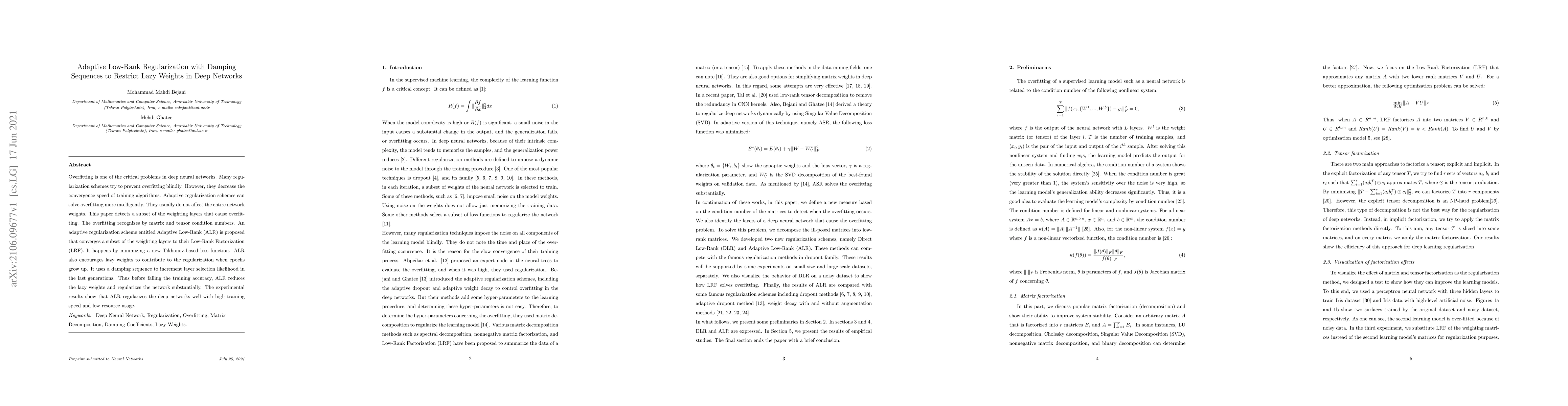 Overfitting is one of the critical problems in deep neural networks. Many regularization schemes try to prevent overfitting blindly. However, they decrease the convergence speed of training algorithms. Adaptive regularization schemes can solve overfitting more intelligently. They usually do not affect the entire network weights. This paper detects a subset of the weighting layers that cause overfitting. The overfitting recognizes by matrix and tensor condition numbers. An adaptive regularization scheme entitled Adaptive Low-Rank (ALR) is proposed that converges a subset of the weighting layers to their Low-Rank Factorization (LRF). It happens by minimizing a new Tikhonov-based loss function. ALR also encourages lazy weights to contribute to the regularization when epochs grow up. It uses a damping sequence to increment layer selection likelihood in the last generations. Thus before falling the training accuracy, ALR reduces the lazy weights and regularizes the network substantially. The experimental results show that ALR regularizes the deep networks well with high training speed and low resource usage.