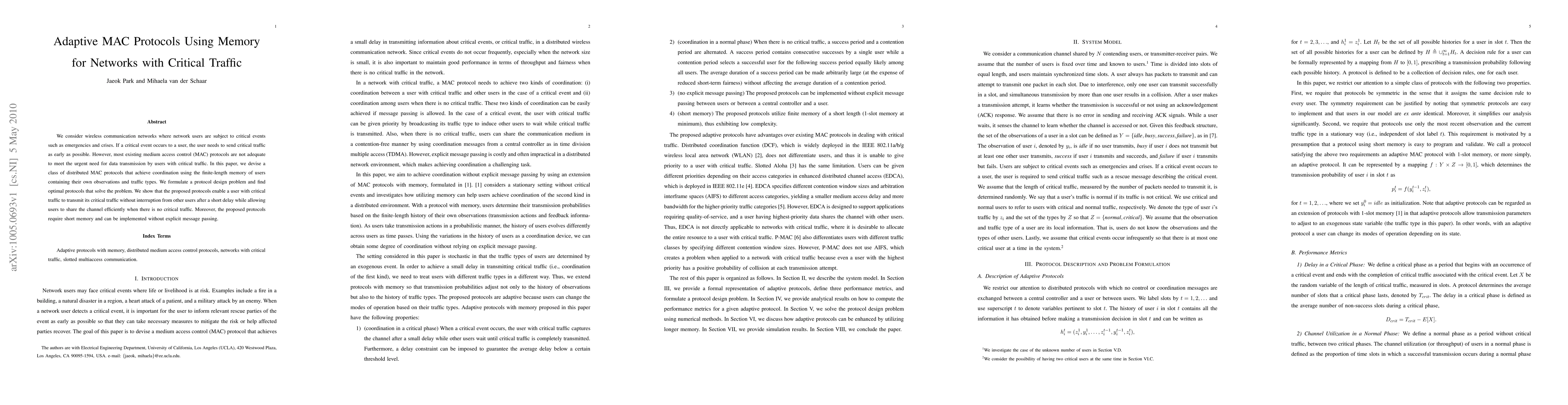 This paper proposes adaptive MAC protocols that use user memory to coordinate critical traffic transmission in wireless networks, enabling short delays for urgent data while sharing the channel efficiently when no traffic is present.