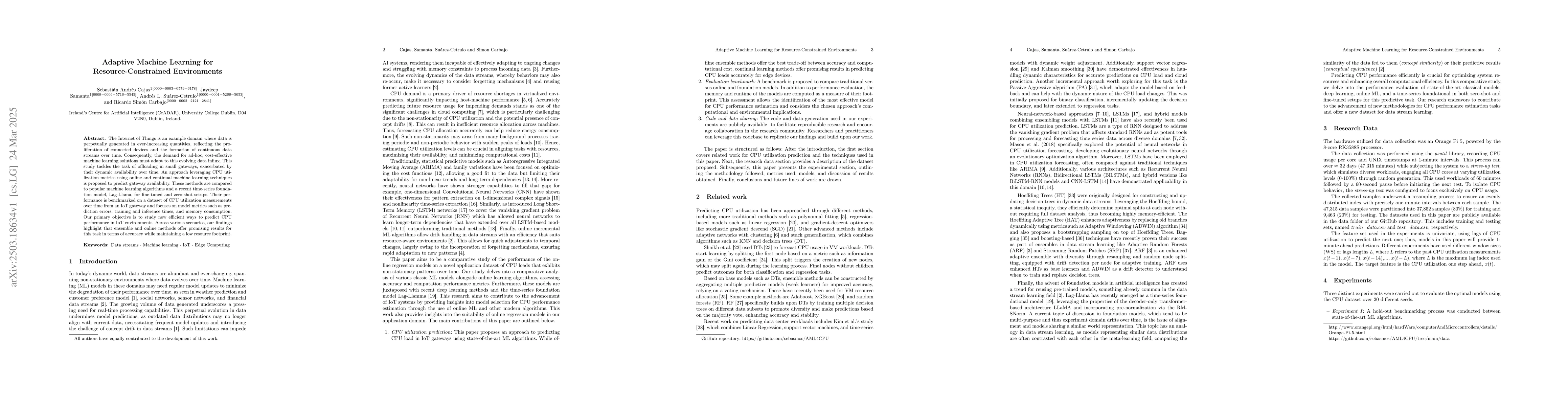 The paper presents a comparative analysis of various machine learning methods for predicting CPU performance in IoT environments, highlighting the effectiveness of ensemble and online learning techniques in resource-constrained settings.