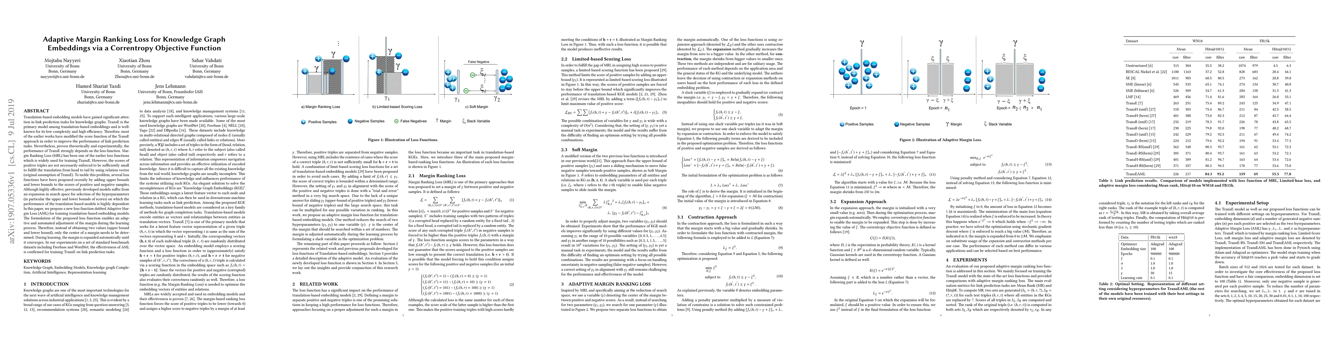 This paper proposes an Adaptive Margin Loss (AML) for knowledge graph embedding models, specifically for TransE, to improve link prediction performance. Unlike traditional Margin Ranking Loss, AML adaptively adjusts the margin during training, simplifying hyperparameter selection and enhancing model efficiency.