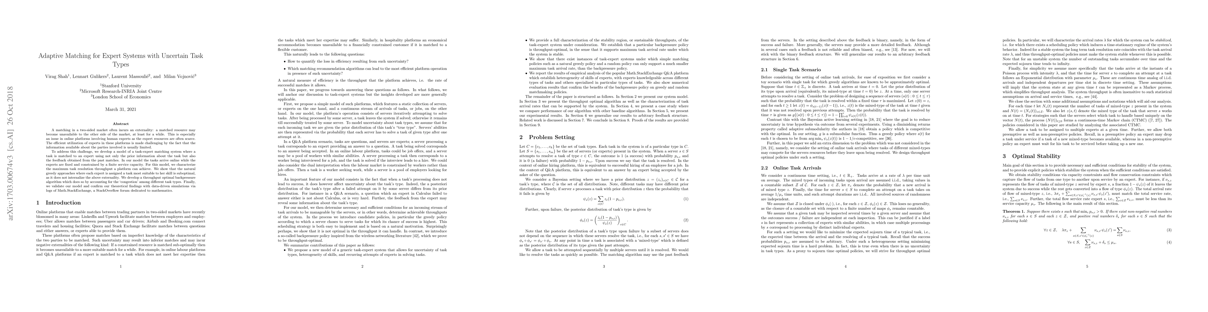 A matching in a two-sided market often incurs an externality: a matched resource may become unavailable to the other side of the market, at least for a while. This is especially an issue in online platforms involving human experts as the expert resources are often scarce. The efficient utilization of experts in these platforms is made challenging by the fact that the information available about the parties involved is usually limited. To address this challenge, we develop a model of a task-expert matching system where a task is matched to an expert using not only the prior information about the task but also the feedback obtained from the past matches. In our model the tasks arrive online while the experts are fixed and constrained by a finite service capacity. For this model, we characterize the maximum task resolution throughput a platform can achieve. We show that the natural greedy approaches where each expert is assigned a task most suitable to her skill is suboptimal, as it does not internalize the above externality. We develop a throughput optimal backpressure algorithm which does so by accounting for the `congestion' among different task types. Finally, we validate our model and confirm our theoretical findings with data-driven simulations via logs of Math.StackExchange, a StackOverflow forum dedicated to mathematics.