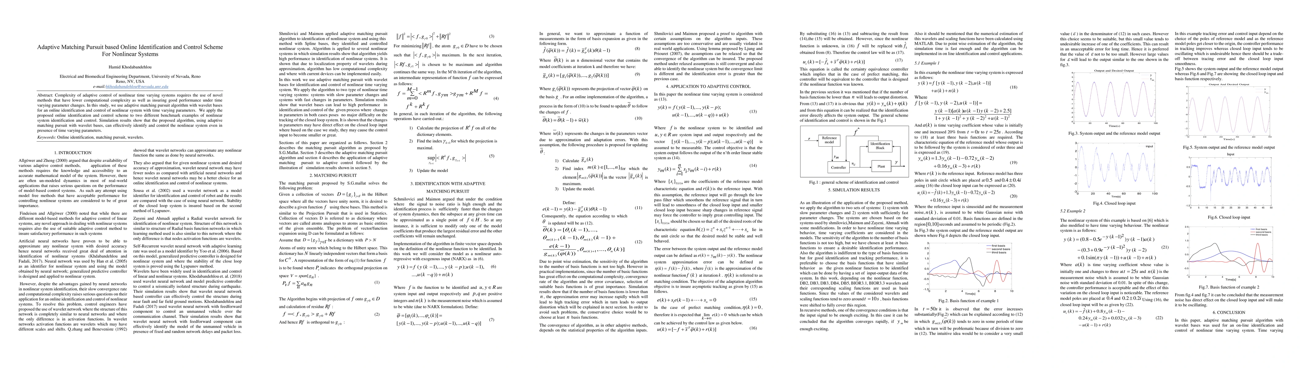 This paper proposes an adaptive matching pursuit algorithm with wavelet bases for online identification and control of nonlinear time-varying systems, demonstrating effective performance in two benchmark examples despite time-varying parameters. Simulation results confirm the method's lower computational complexity and good performance.