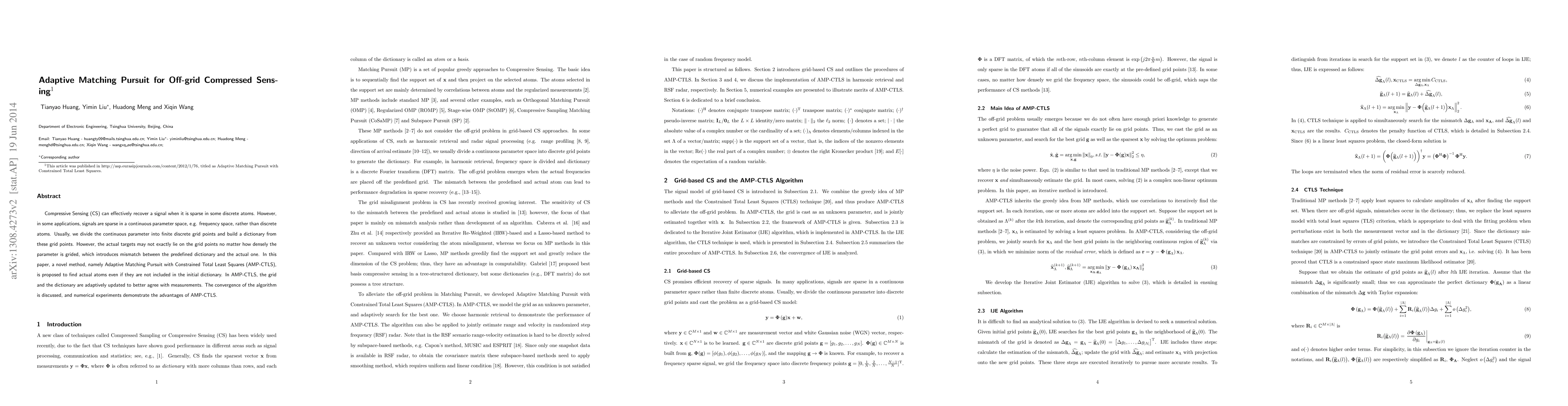 Compressive sensing (CS) can effectively recover a signal when it is sparse in some discrete atoms. However, in some applications, signals are sparse in a continuous parameter space, e.g., frequency space, rather than discrete atoms. Usually, we divide the continuous parameter into finite discrete grid points and build a dictionary from these grid points. However, the actual targets may not exactly lie on the grid points no matter how densely the parameter is grided, which introduces mismatch between the predefined dictionary and the actual one. In this article, a novel method, namely adaptive matching pursuit with constrained total least squares (AMP-CTLS), is proposed to find actual atoms even if they are not included in the initial dictionary. In AMP-CTLS, the grid and the dictionary are adaptively updated to better agree with measurements. The convergence of the algorithm is discussed, and numerical experiments demonstrate the advantages of AMP-CTLS.
