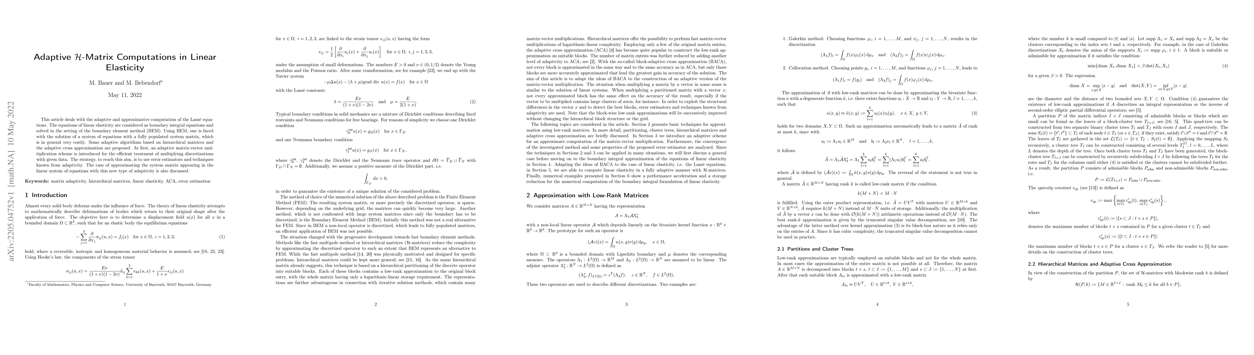 This article deals with the adaptive and approximative computation of the Lam\'e equations. The equations of linear elasticity are considered as boundary integral equations and solved in the setting of the boundary element method (BEM). Using BEM, one is faced with the solution of a system of equations with a fully populated system matrix, which is in general very costly. Some adaptive algorithms based on hierarchical matrices and the adaptive cross approximation are proposed. At first, an adaptive matrix-vector multiplication scheme is introduced for the efficient treatment of multiplying discretizations with given data. The strategy, to reach this aim, is to use error estimators and techniques known from adaptivity. The case of approximating the system matrix appearing in the linear system of equations with this new type of adaptivity is also discussed.