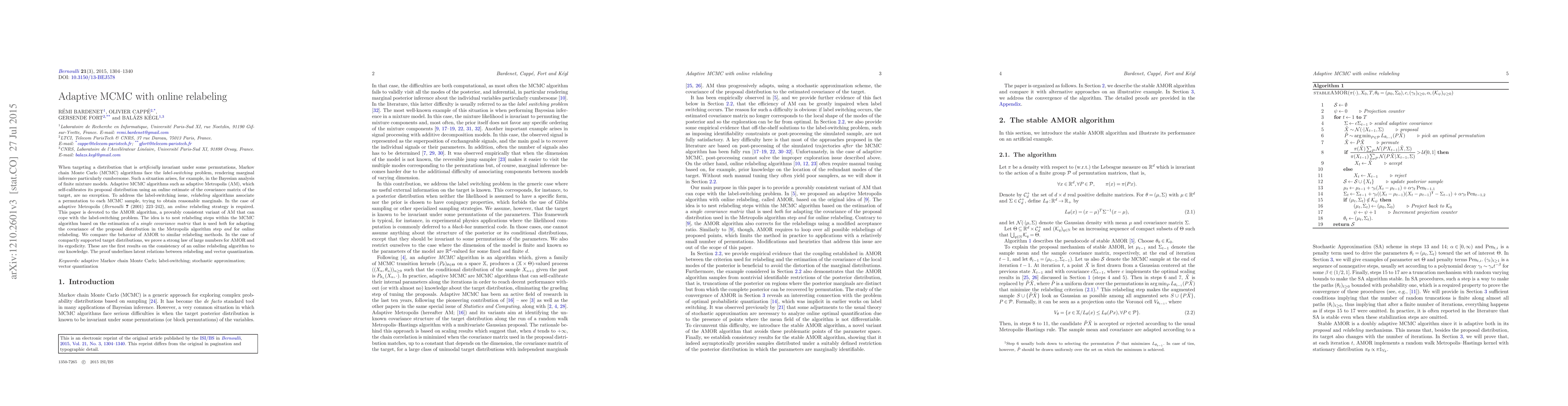 This paper introduces the AMOR algorithm, an adaptive MCMC method that incorporates online relabeling to address the label-switching problem in distributions invariant under permutation, such as finite mixture models. The AMOR algorithm nests relabeling steps within the MCMC process, proving its consistency and ergodicity for compactly supported target distributions.