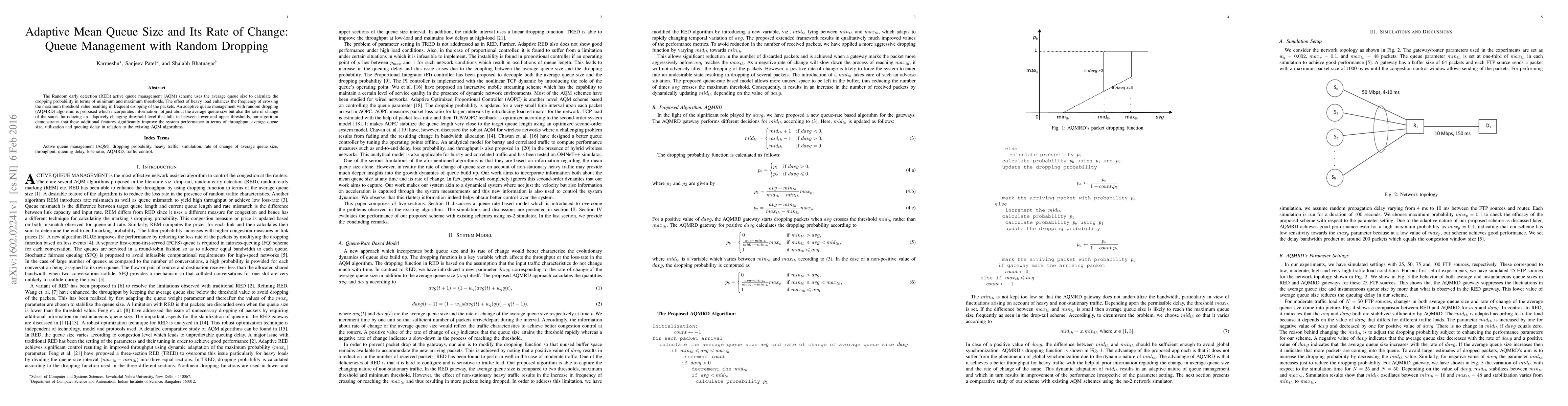 The paper proposes an adaptive queue management algorithm with random dropping (AQMRD) that considers both average queue size and its rate of change, improving throughput, average queue size, utilization, and queuing delay compared to existing RED-based AQM schemes. The adaptive threshold level enhances performance by preventing frequent packet drops during heavy loads.