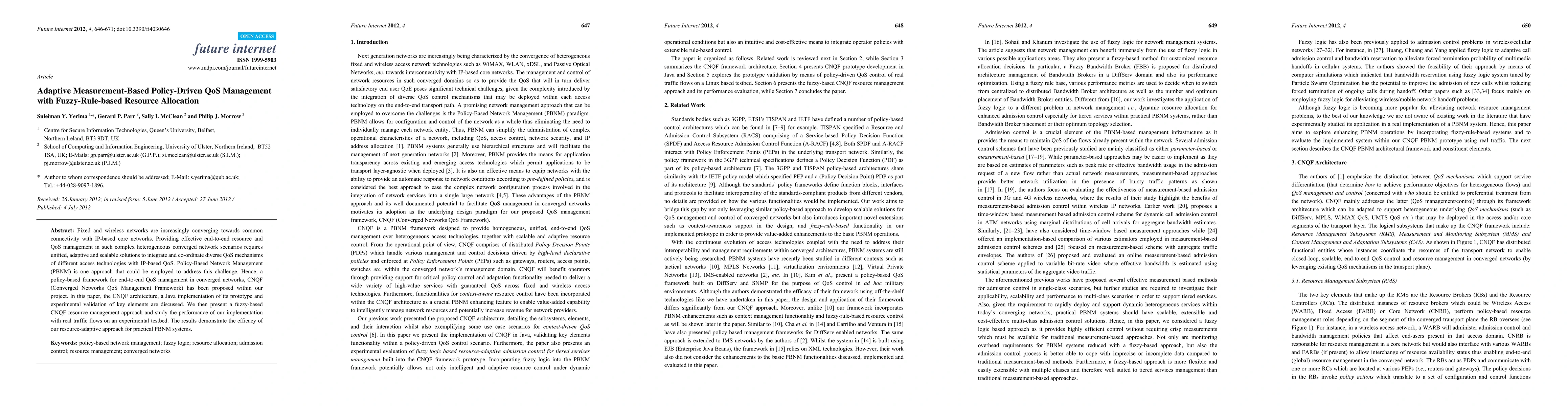 This paper proposes a policy-driven framework, CNQF, for adaptive QoS management in converged networks using fuzzy-rule-based resource allocation. The study demonstrates the effectiveness of the approach through a prototype implementation and real traffic flow experiments on a testbed.