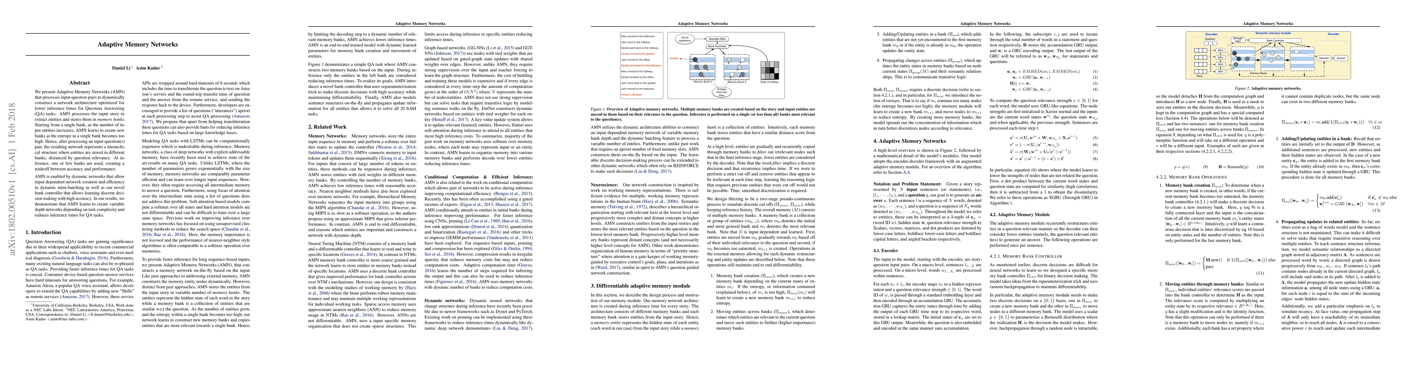 We present Adaptive Memory Networks (AMN) that processes input-question pairs to dynamically construct a network architecture optimized for lower inference times for Question Answering (QA) tasks. AMN processes the input story to extract entities and stores them in memory banks. Starting from a single bank, as the number of input entities increases, AMN learns to create new banks as the entropy in a single bank becomes too high. Hence, after processing an input-question(s) pair, the resulting network represents a hierarchical structure where entities are stored in different banks, distanced by question relevance. At inference, one or few banks are used, creating a tradeoff between accuracy and performance. AMN is enabled by dynamic networks that allow input dependent network creation and efficiency in dynamic mini-batching as well as our novel bank controller that allows learning discrete decision making with high accuracy. In our results, we demonstrate that AMN learns to create variable depth networks depending on task complexity and reduces inference times for QA tasks.